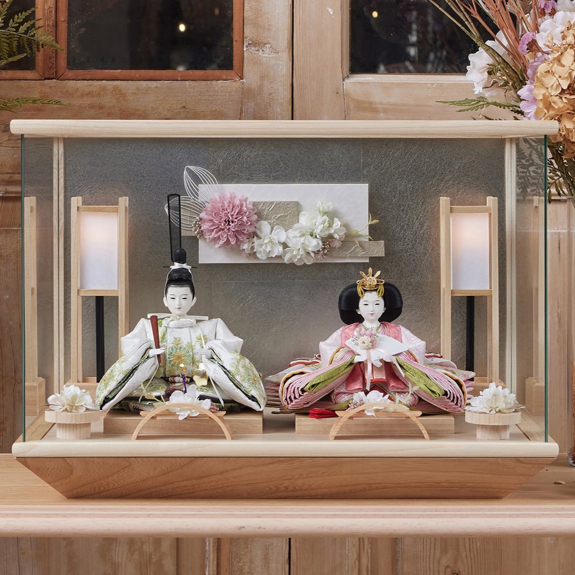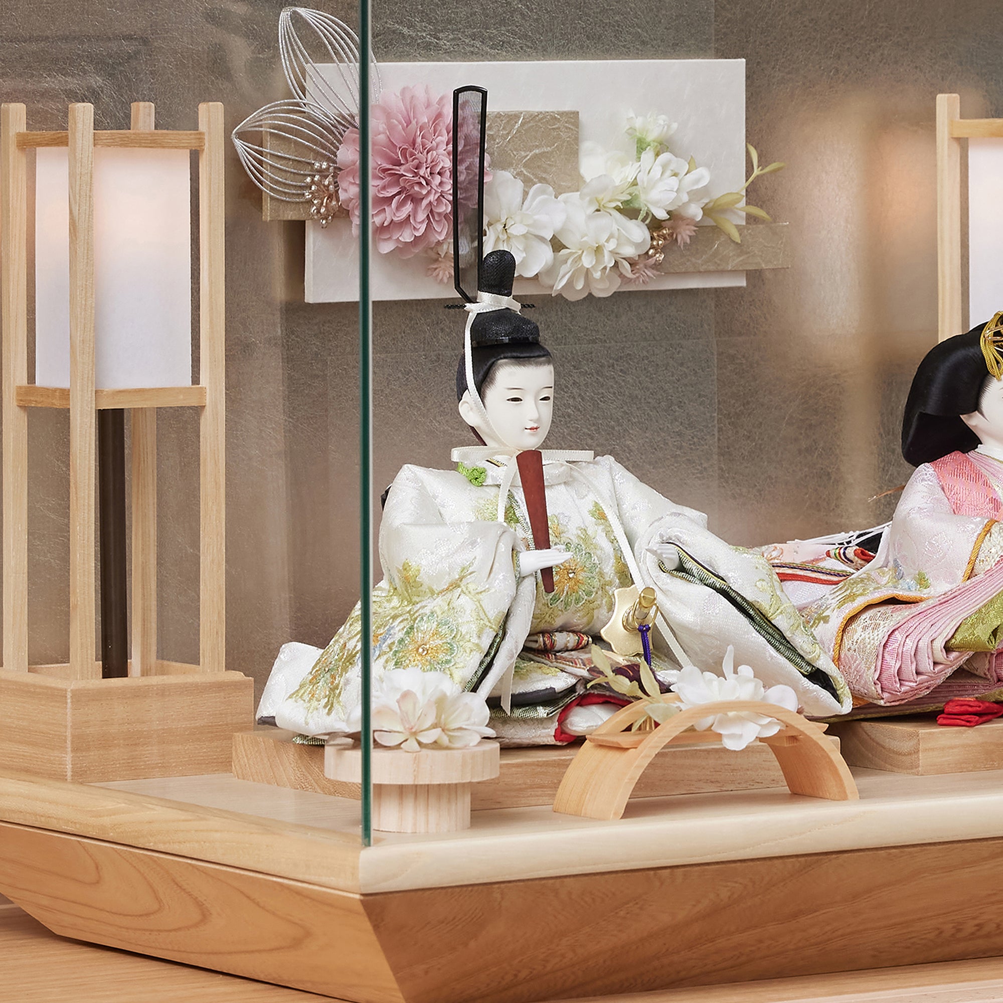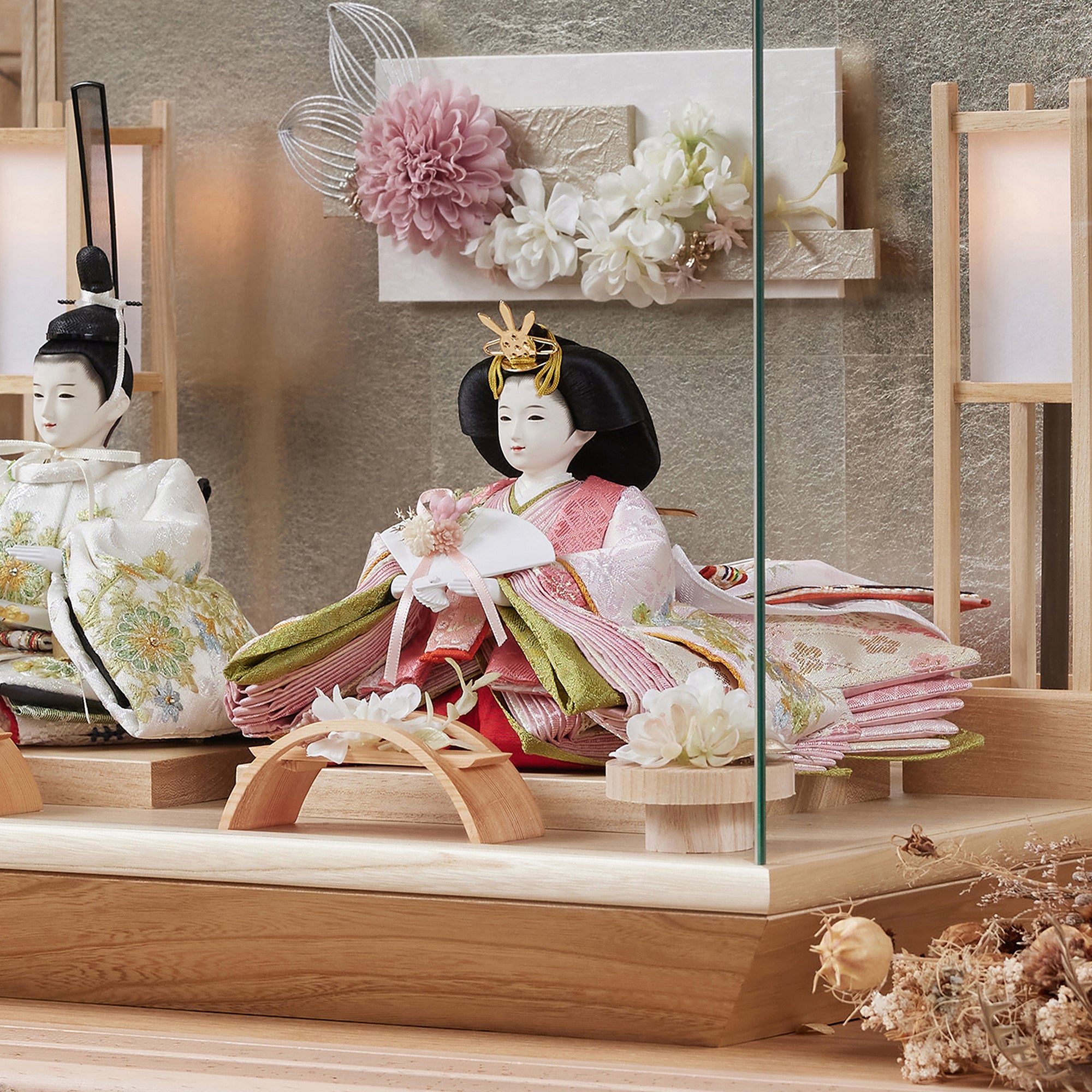 通常2mm厚が一般的な中、当店ではより高品質なAGC製3mmガラスを採用しています。厚みが増すことで強度と安全性が高まり、透明度の高いクリアな美しさを保ちます。大切な雛人形を守りながら、高級感のある見栄えを実現しています。
