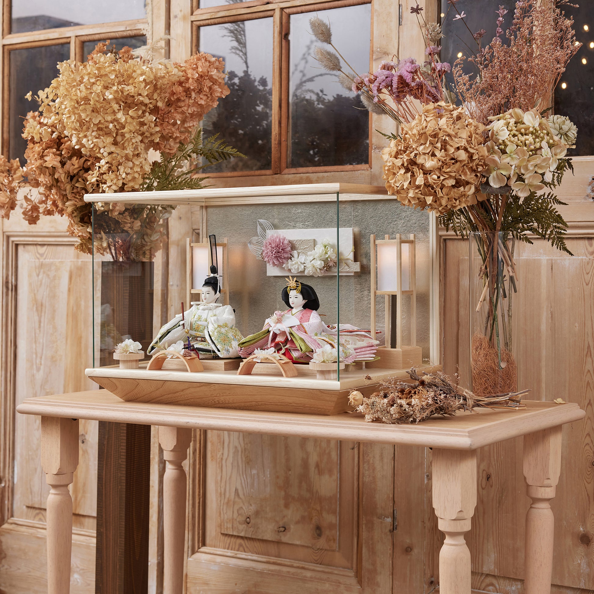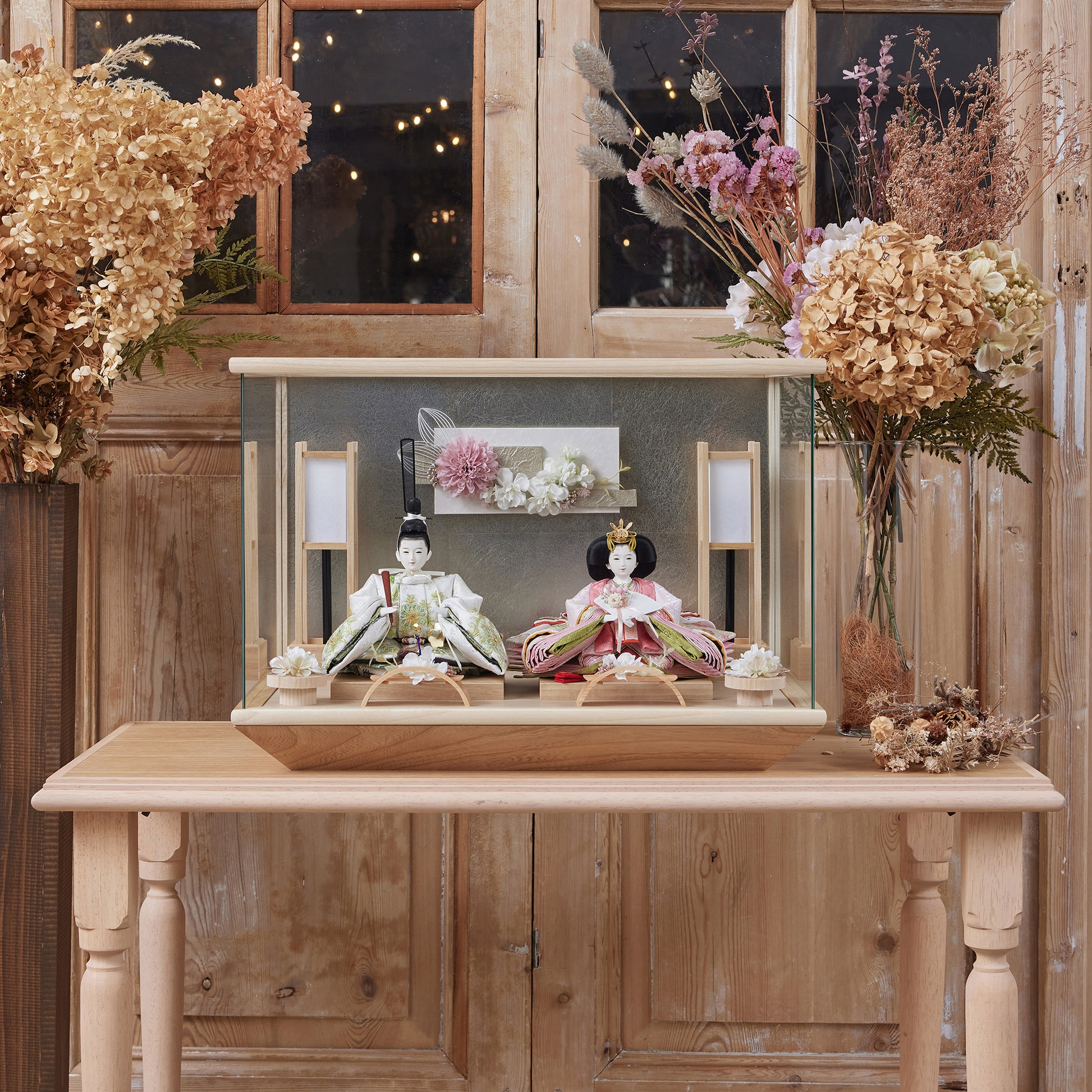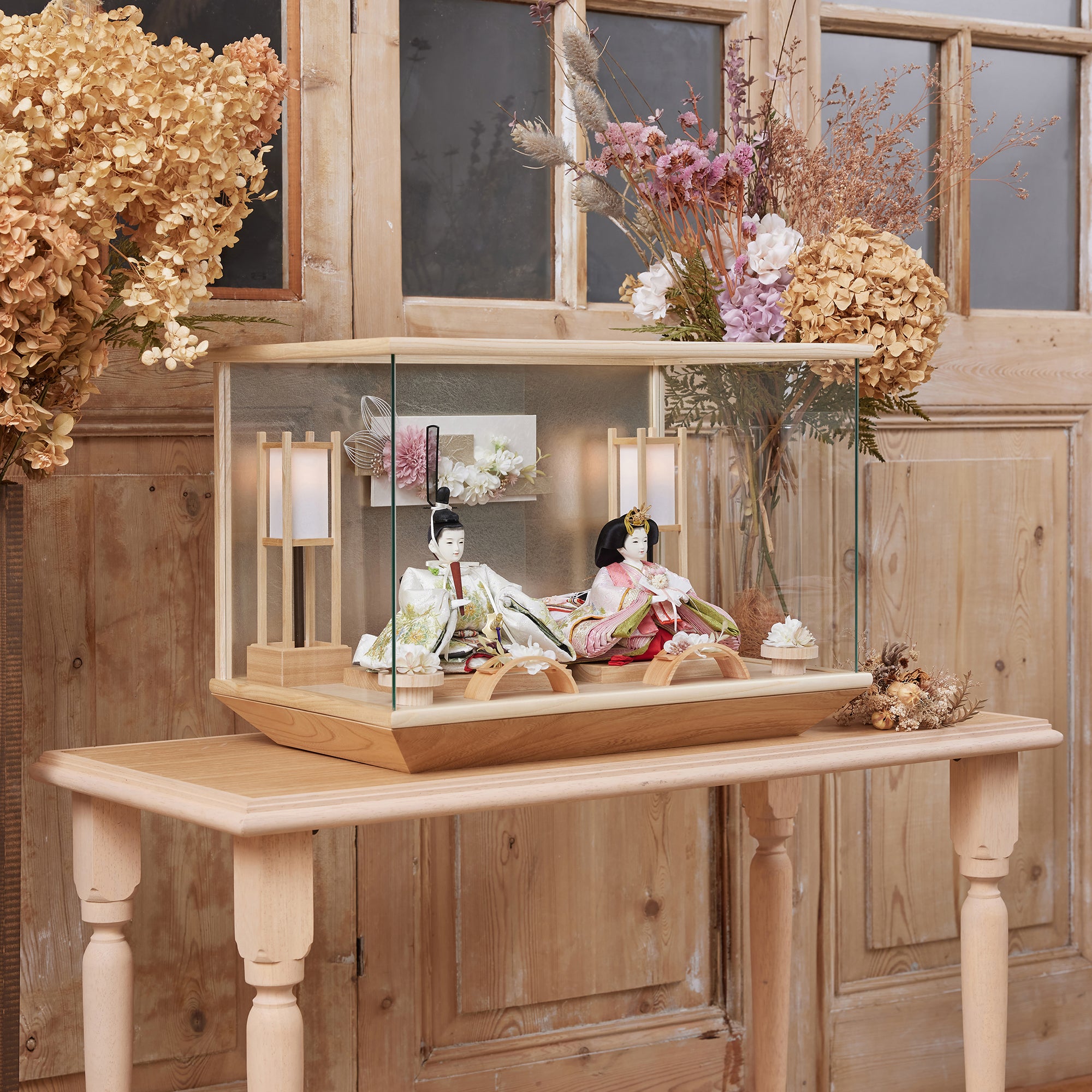 通常2mm厚が一般的な中、当店ではより高品質なAGC製3mmガラスを採用しています。厚みが増すことで強度と安全性が高まり、透明度の高いクリアな美しさを保ちます。大切な雛人形を守りながら、高級感のある見栄えを実現しています。