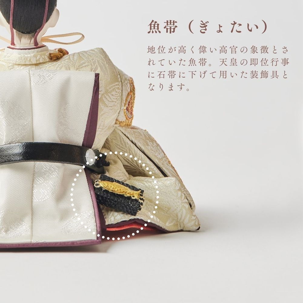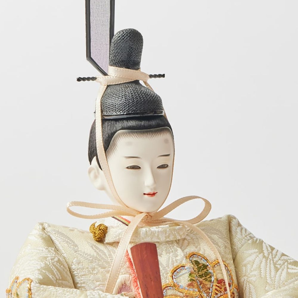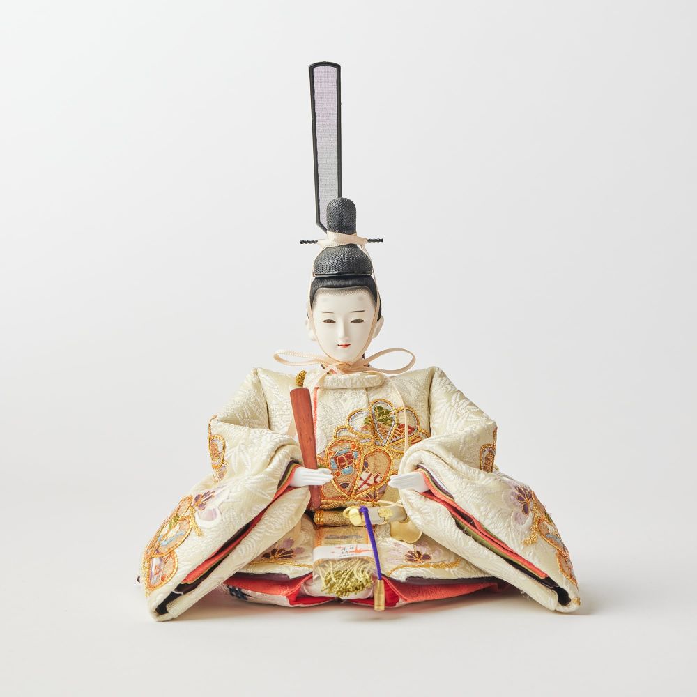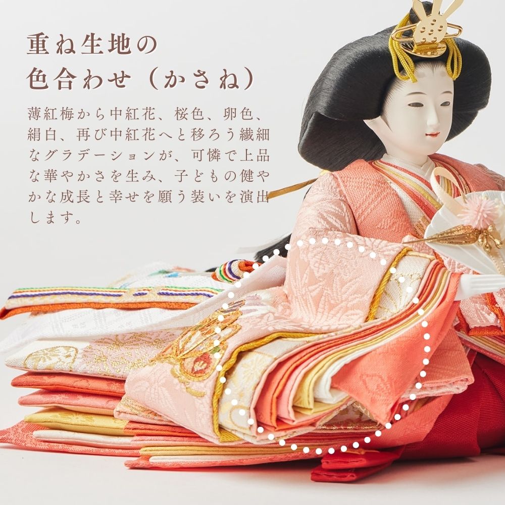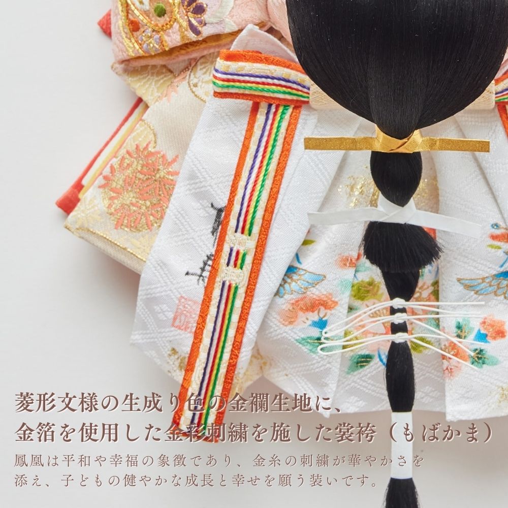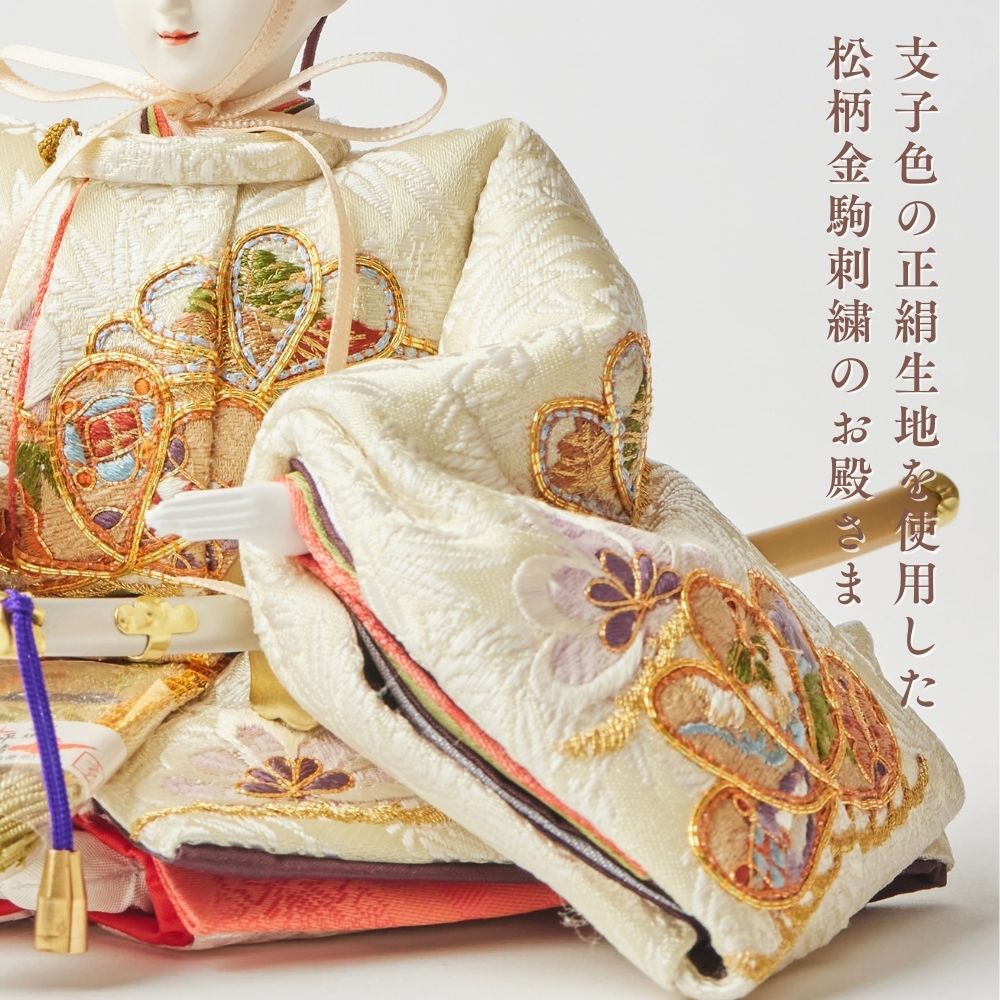 松柄金駒刺繍の支子色雛人形は、成長と繁栄を願い、親の愛情と未来への希望を象徴する特別な存在です。