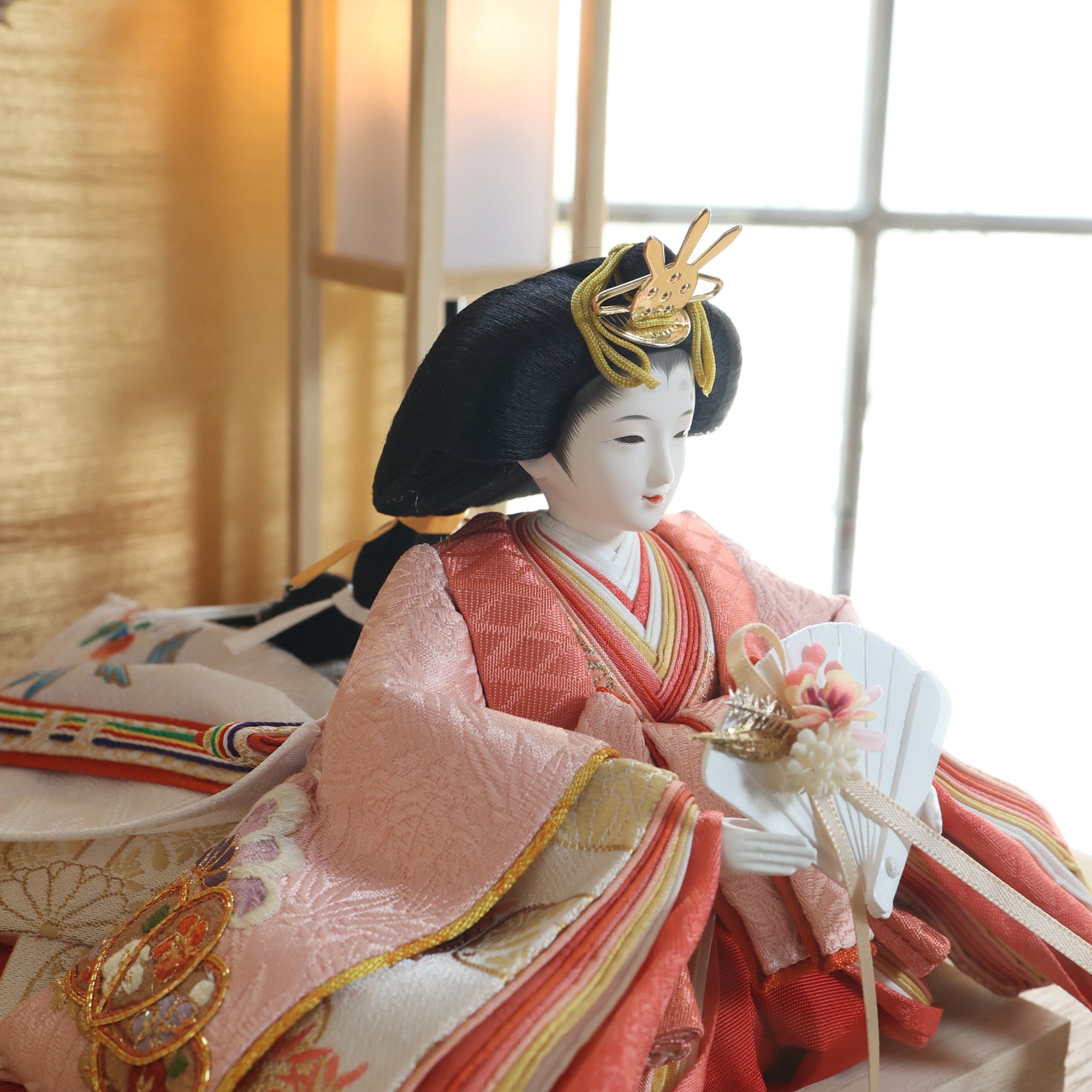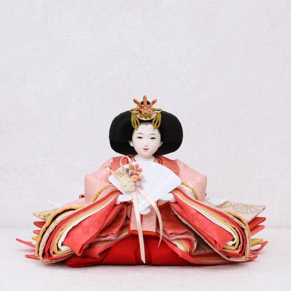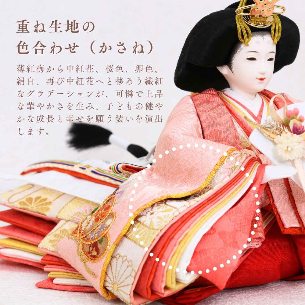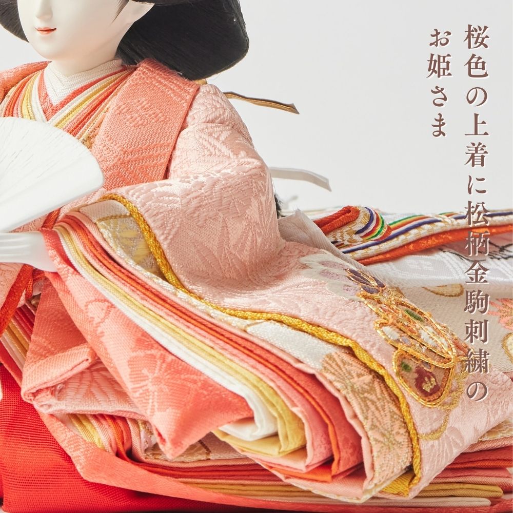 桜色の装飾と松柄金駒刺繍の雛人形は、春の訪れと赤ちゃんの成長を願い、家族に温もりと希望をもたらします。