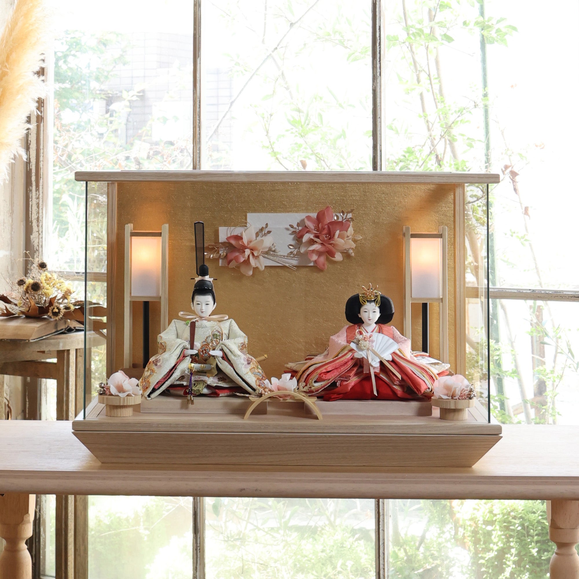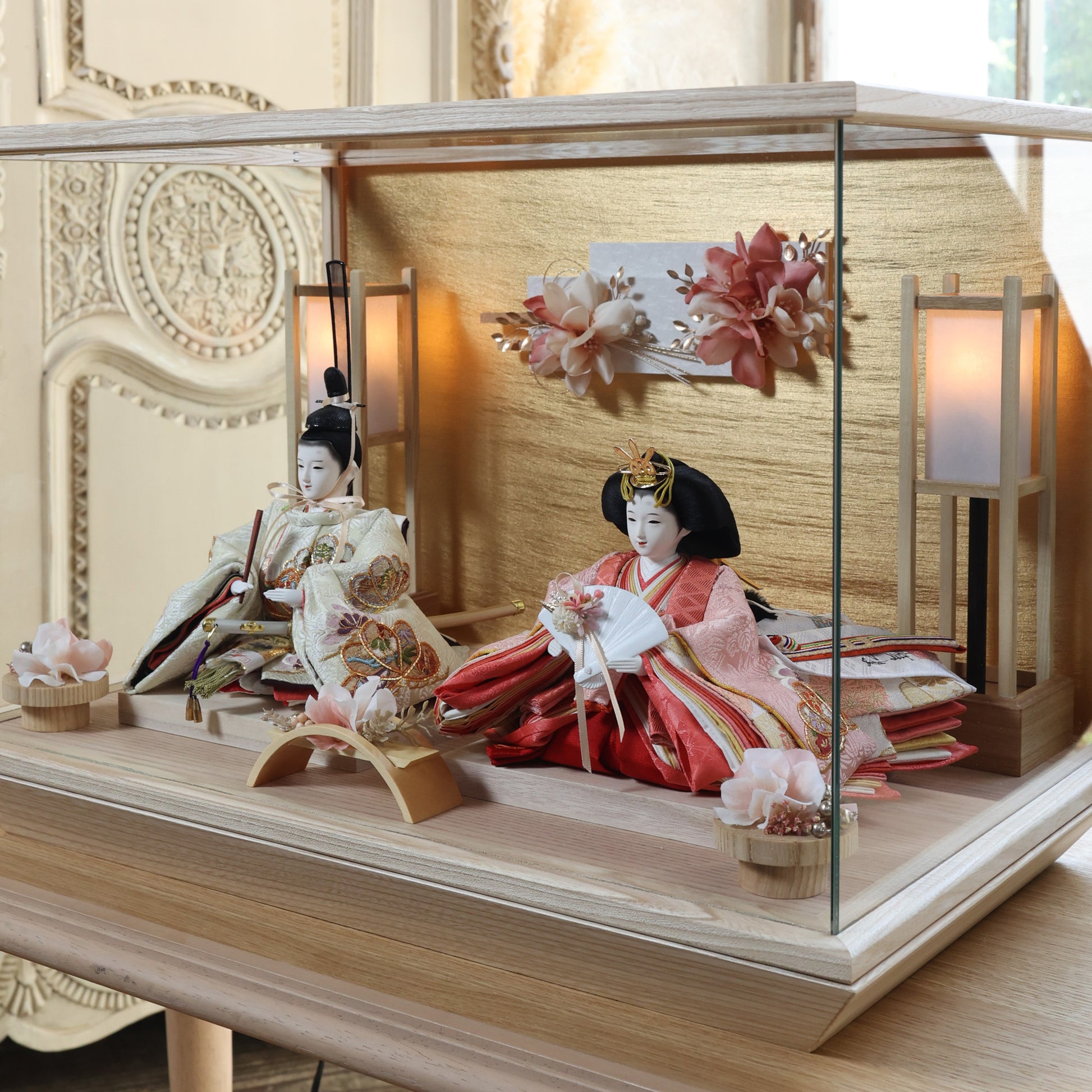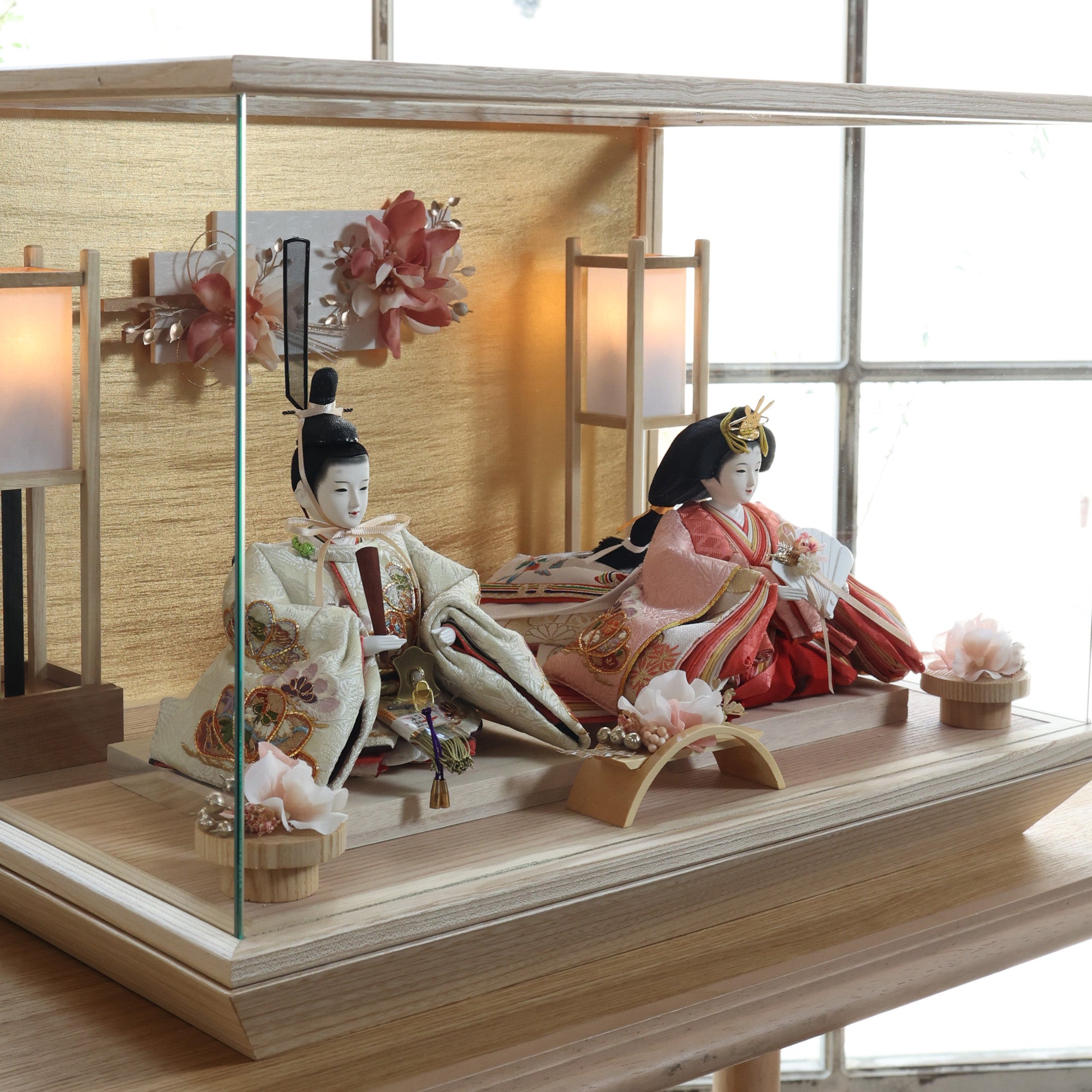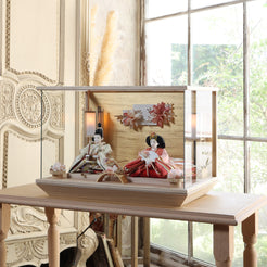 通常2mm厚が一般的な中、当店ではより高品質なAGC製3mmガラスを採用しています。厚みが増すことで強度と安全性が高まり、透明度の高いクリアな美しさを保ちます。大切な雛人形を守りながら、高級感のある見栄えを実現しています。