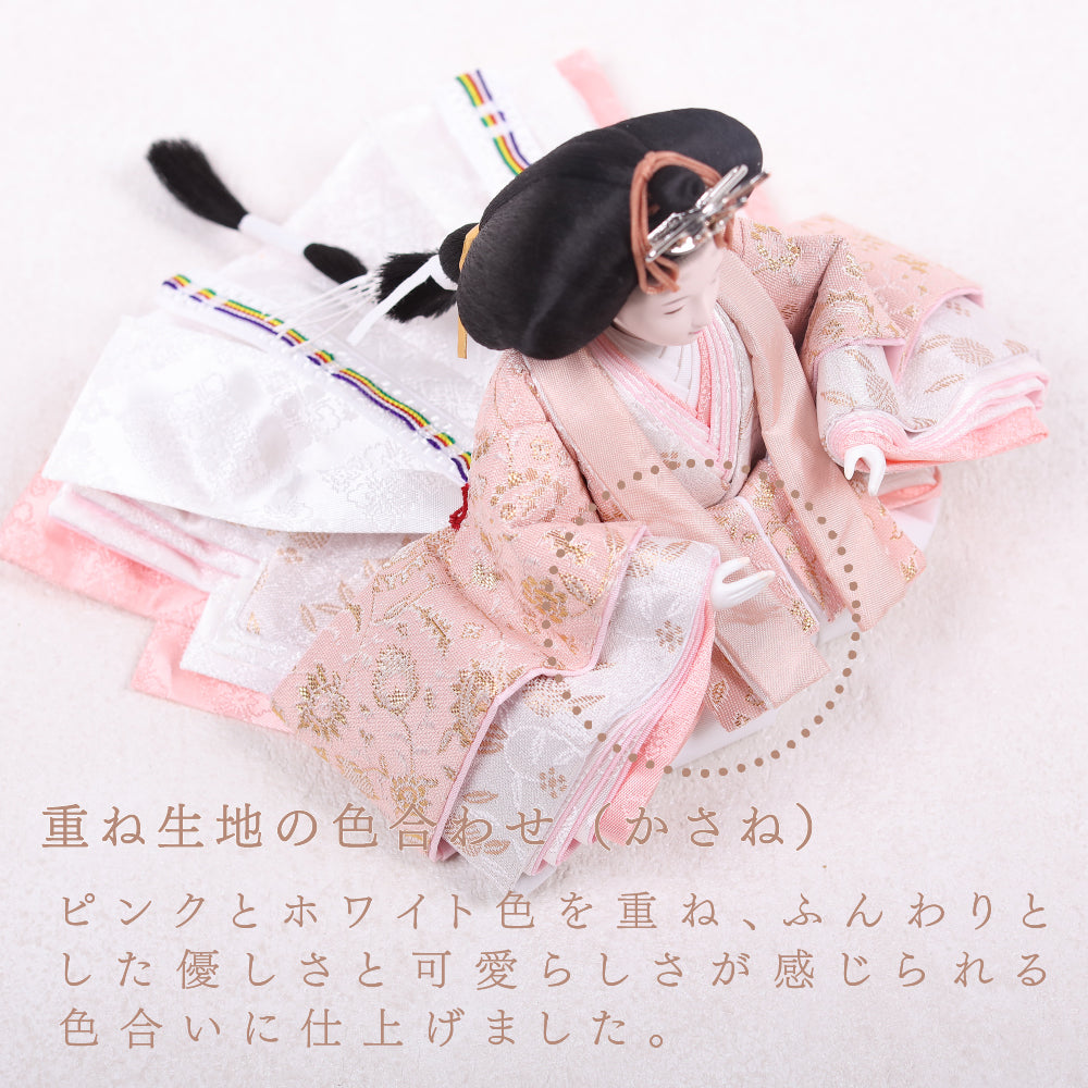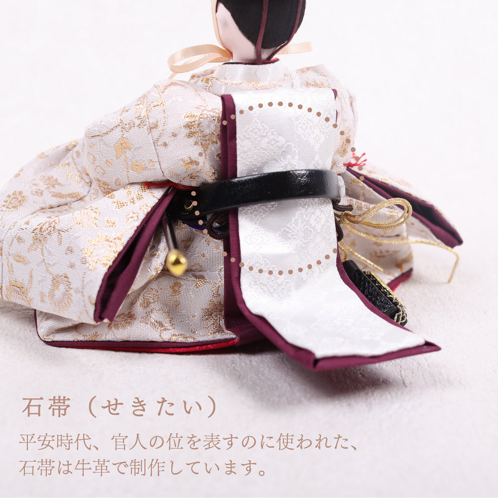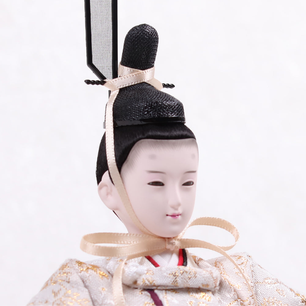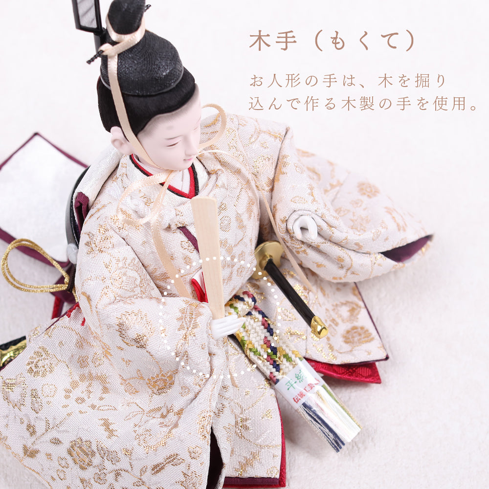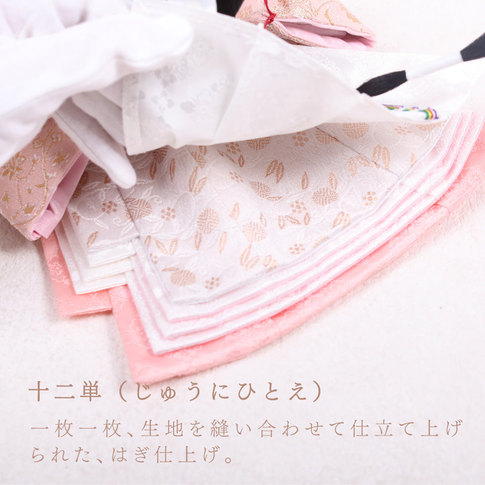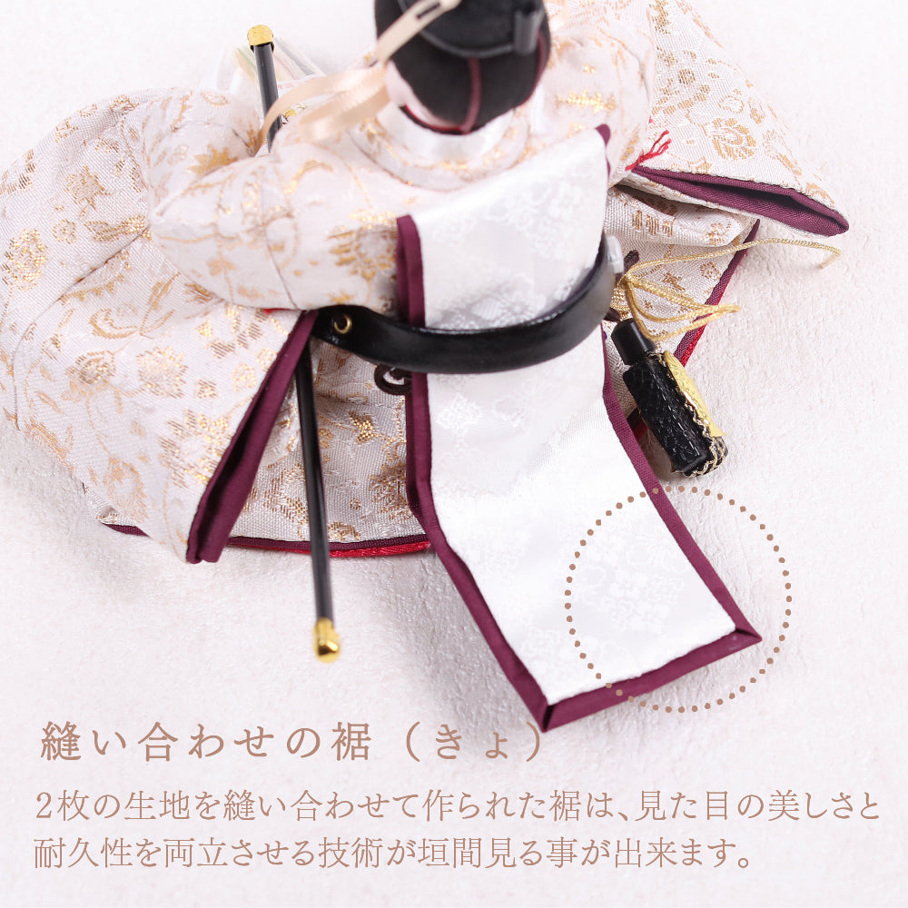 この雛人形は、唐花文様のアイボリーの装いが特徴で、華やかさを放っています。淡い色合いは赤ちゃんの純真さを象徴し、幸福や繁栄を願う意味が込められています。唐花文様は古代からの美しさを受け継ぎ、成長と繁栄を示しつつ春の訪れを感じさせます。アイボリーの柔らかなトーンが清らかさを演出し、ひな祭りの優雅さを際立たせます。この装いは、赤ちゃんの健やかな成長と幸せな未来を願う愛情が詰まった宝物であり、見る者に深い感動を与えます。