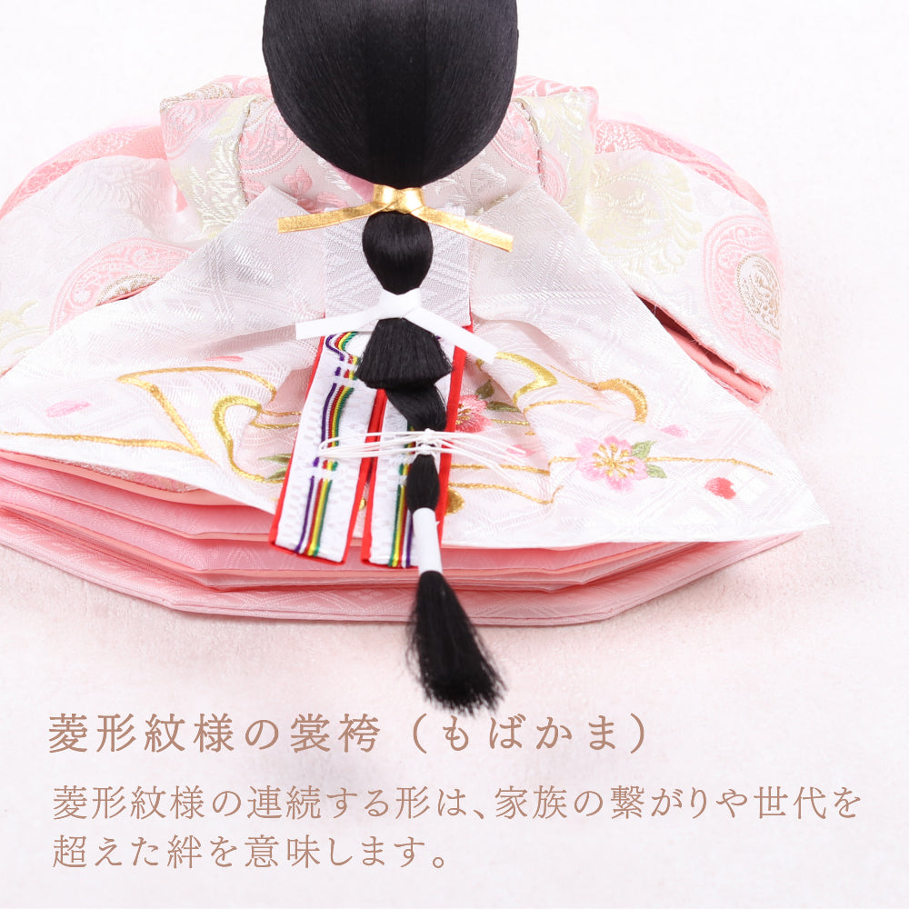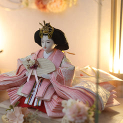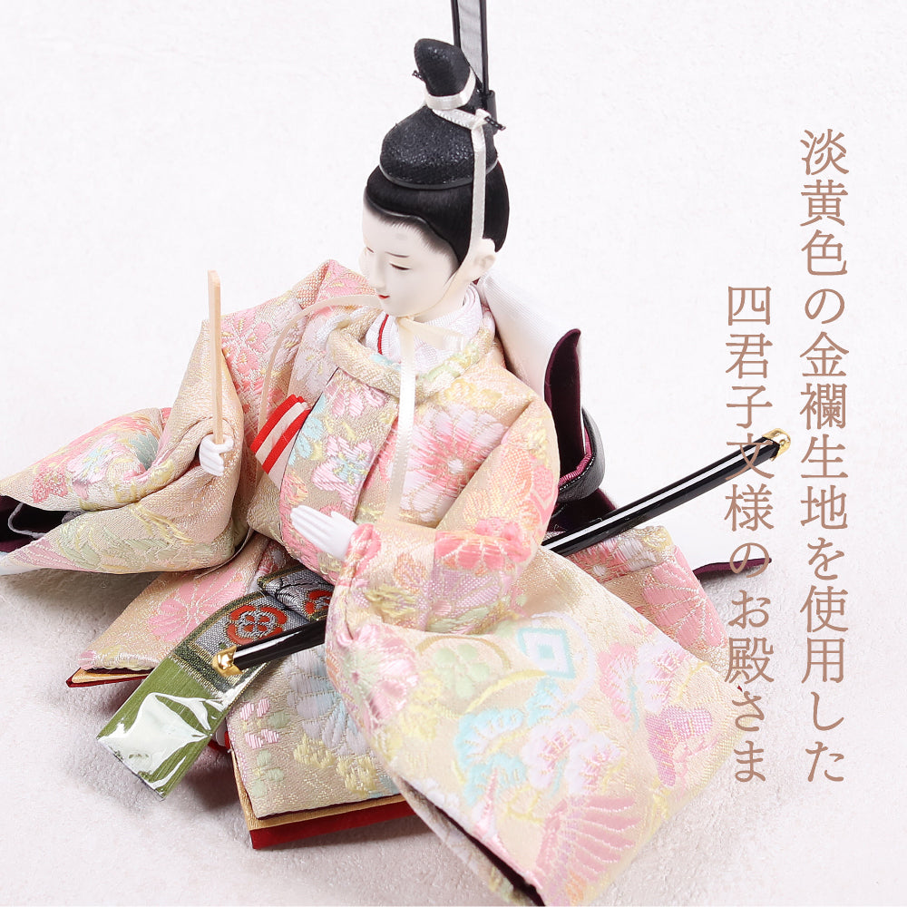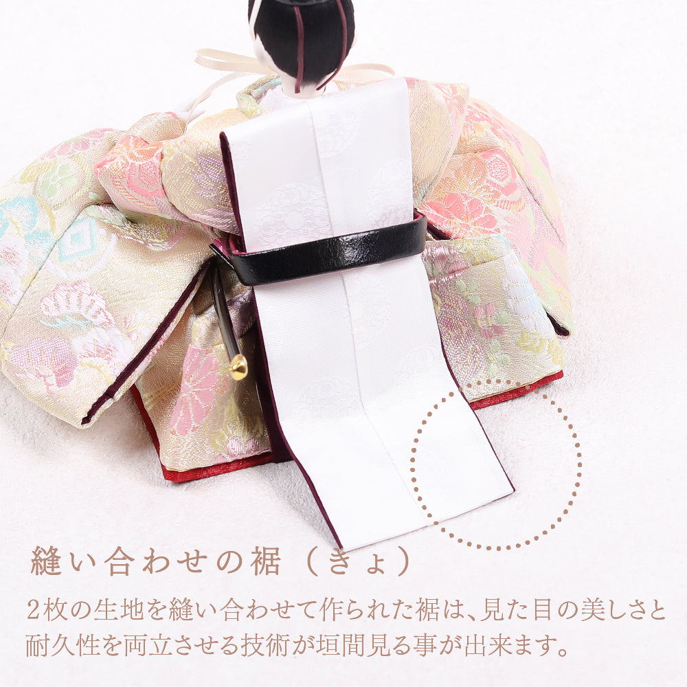 金襴は、豪華な織物で、全て金糸で模様を織り出しています。この技法は中国の宋代に始まり、明の時代に栄えました。日本には室町時代に伝来し、当初は「織金(しょくきん)」と呼ばれていました。金襴は金を多く用いているため、特に華やかで、雛人形の衣装や、着物の帯にもよく使われ、その黄金色の輝きが重厚感を与えます。金襴の模様は細やかで、職人の高い技術が必要です。雛人形に使用することで、伝統的な美しさを引き立て、特別な存在感を生み出します
