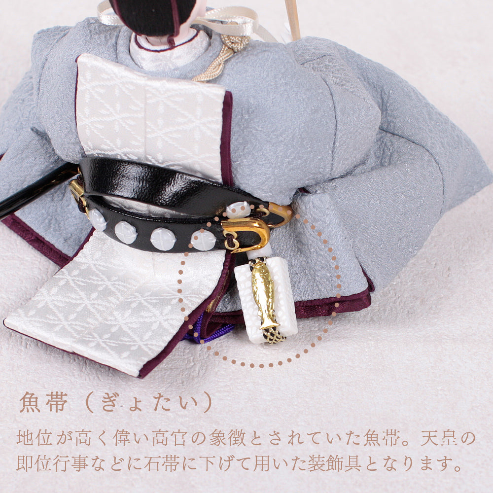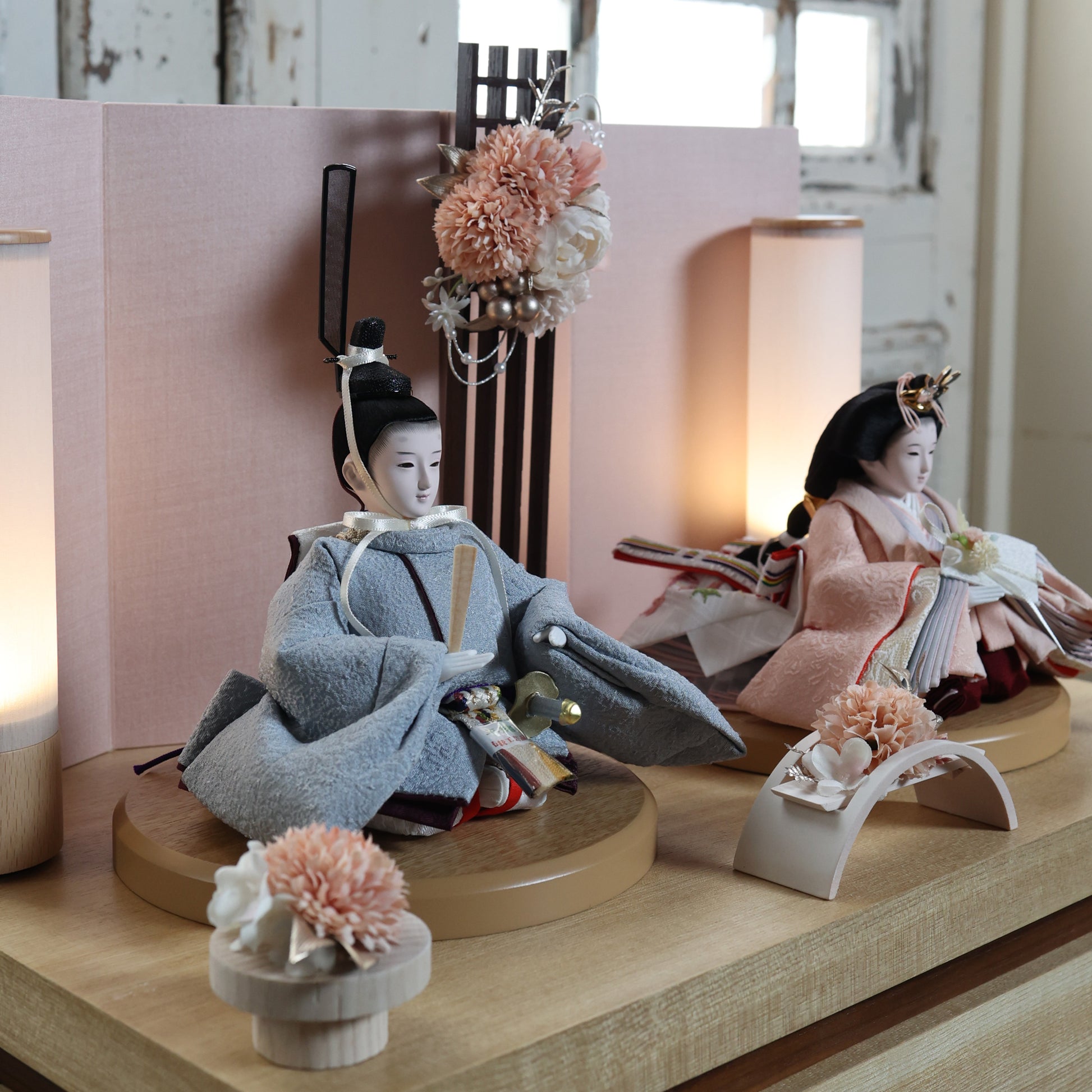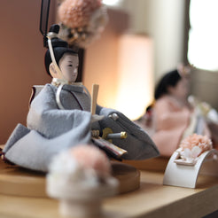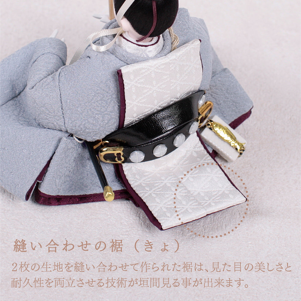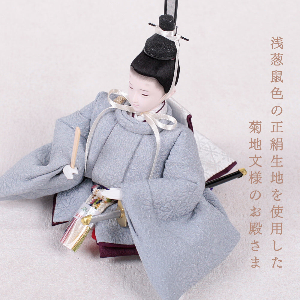 この雛人形は、上質な正絹生地に施された菊模様が特徴で、菊は「不老長寿」を象徴しています。その力強さと生命力は、赤ちゃんの無限の可能性と成長を祝福するデザインとなっています。柔らかな曲線の菊の柄は、愛と未来への期待を表現。また、衣装には浅葱鼠色(あさぎねずみいろ)が採用され、優しい青緑と灰色の融合が赤ちゃんの清らかさを示し、見る人に安らぎを与えます。正絹の滑らかな質感は高級感を伝え、特別な雛人形として赤ちゃんの成長と家族の繁栄を祝います。