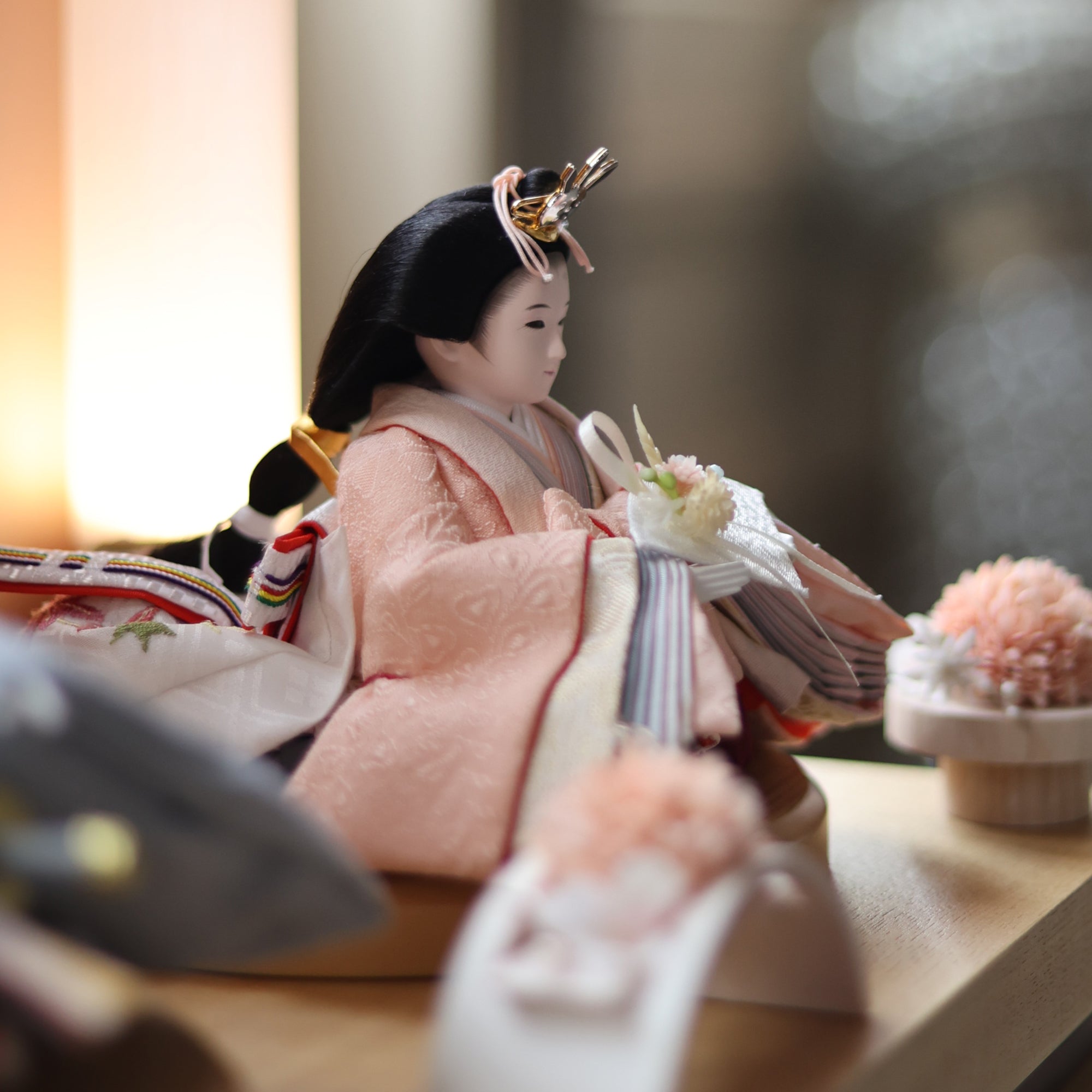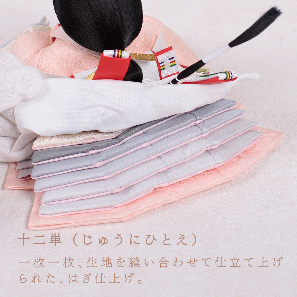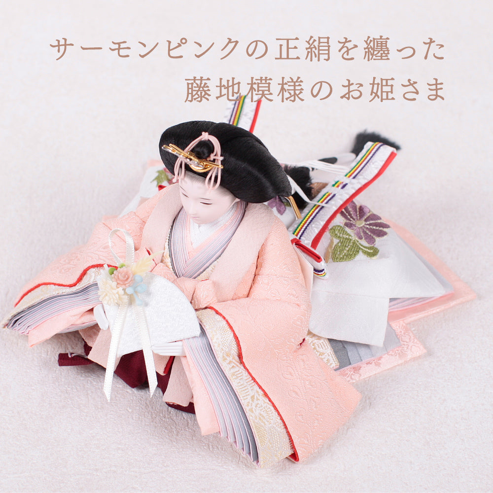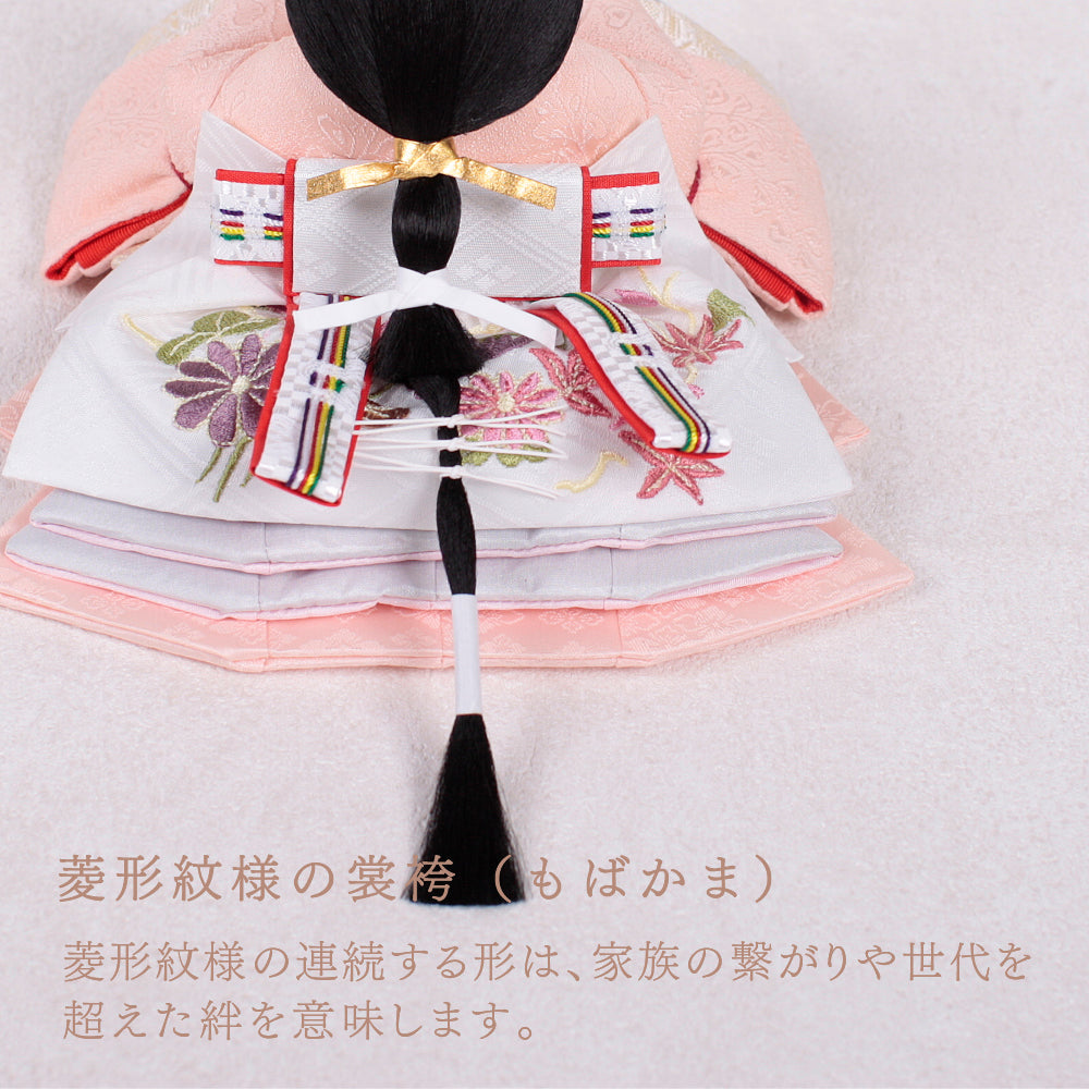 藤地模様の正絹生地を用い、伝統美と優雅さを融合させた雛人形です。藤は古来より繁栄と絆を象徴し、赤ちゃんの成長と家族の繁栄を願う意味が込められています。衣装に施されたサーモンピンクの上着は、優しさや温かさを表現し、健やかな命の息吹を感じさせる色合いです。柔らかな正絹の質感が、見る者に上品な印象を与え、愛らしい雛人形の姿を引き立てています。匠の技が光るこの作品は、家族の未来を祝福する心温まる雛人形です。