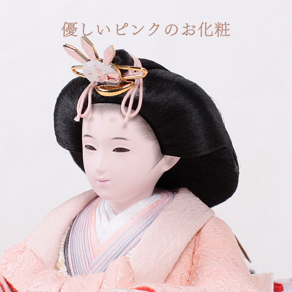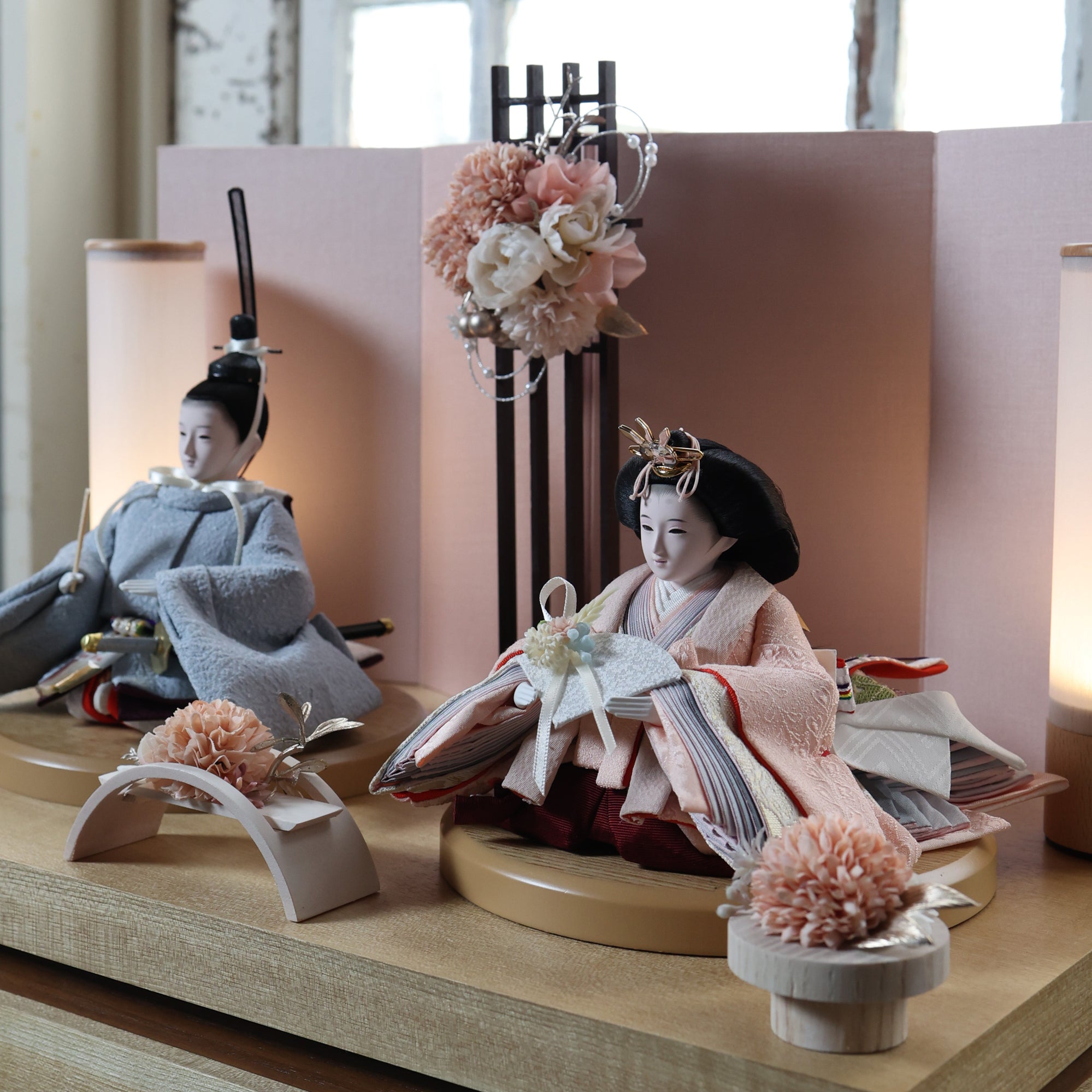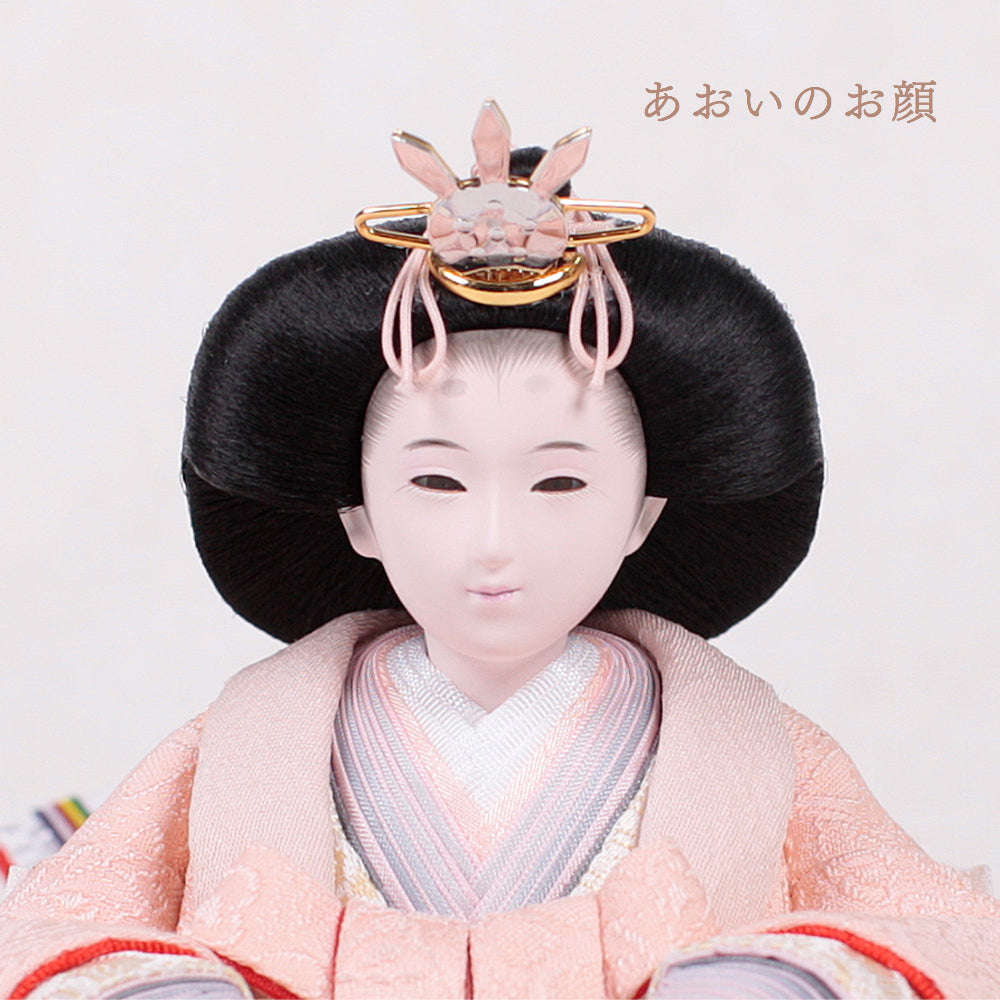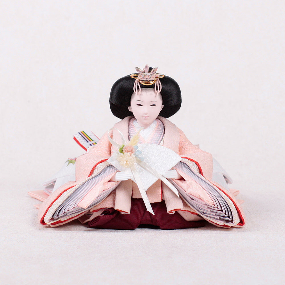 藤地模様の正絹生地を用い、伝統美と優雅さを融合させた雛人形です。藤は古来より繁栄と絆を象徴し、赤ちゃんの成長と家族の繁栄を願う意味が込められています。衣装に施されたサーモンピンクの上着は、優しさや温かさを表現し、健やかな命の息吹を感じさせる色合いです。柔らかな正絹の質感が、見る者に上品な印象を与え、愛らしい雛人形の姿を引き立てています。匠の技が光るこの作品は、家族の未来を祝福する心温まる雛人形です。