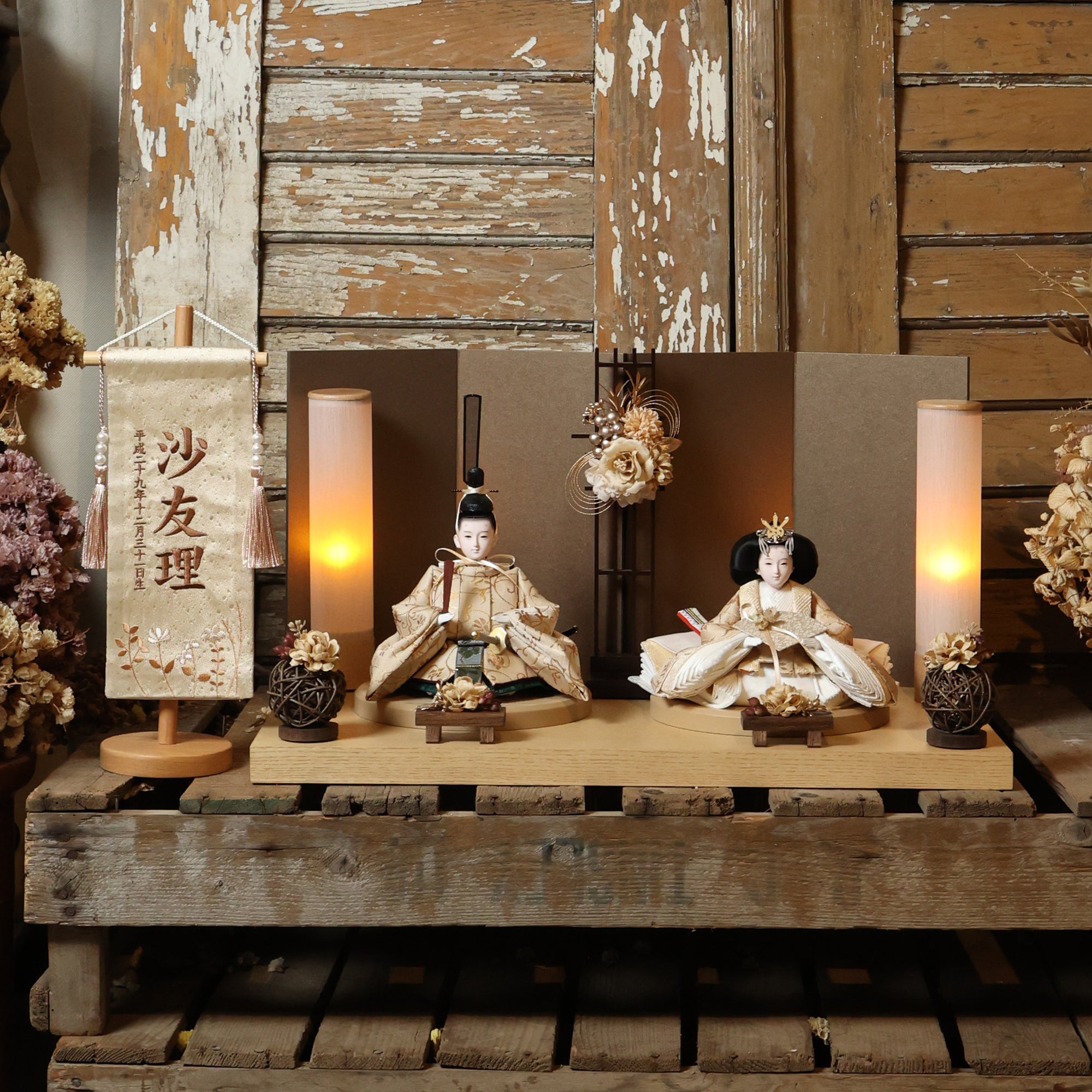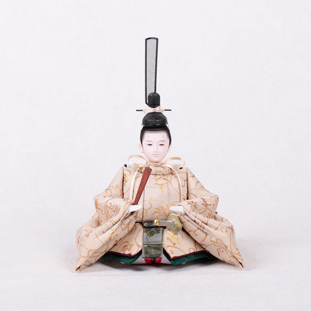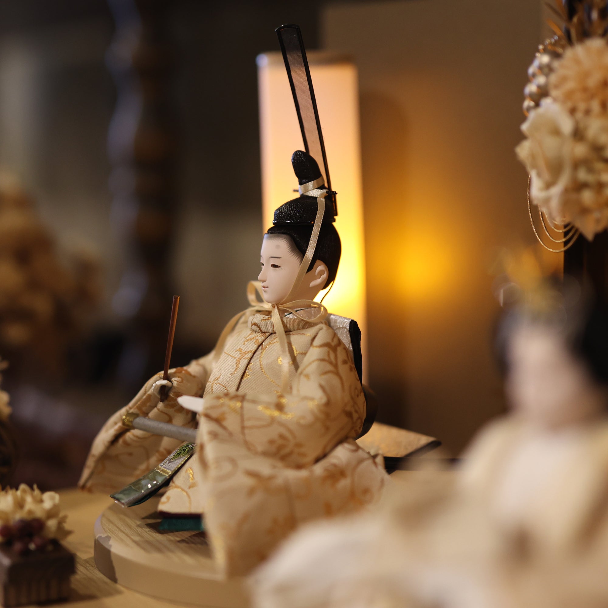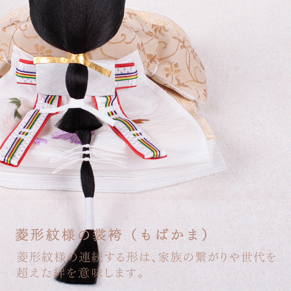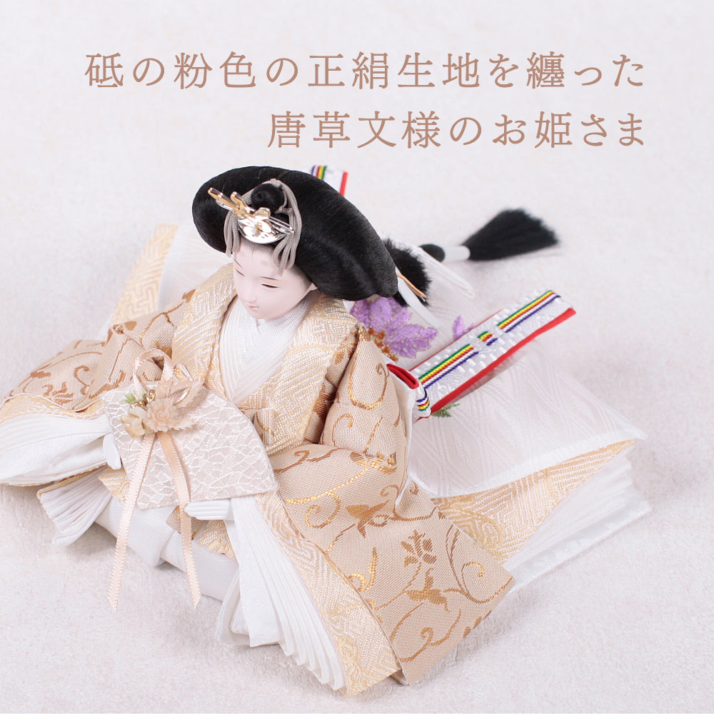 唐草文様と砥の粉色の衣装の雛人形は、赤ちゃんの成長と幸福を願う、生命力と清らかさを象徴する優雅な存在です。