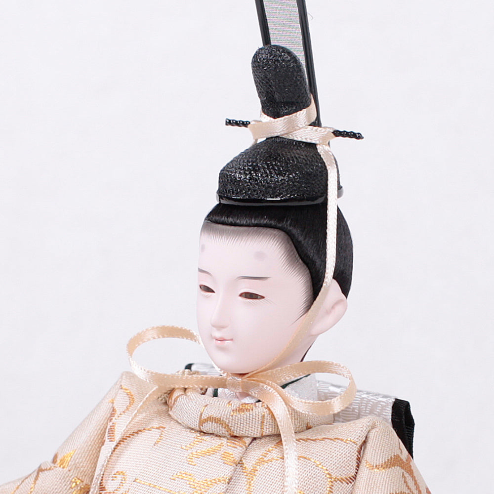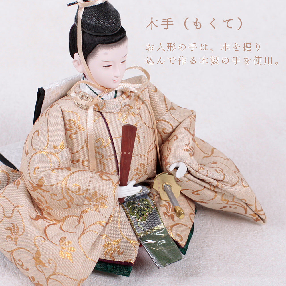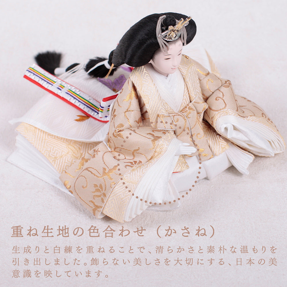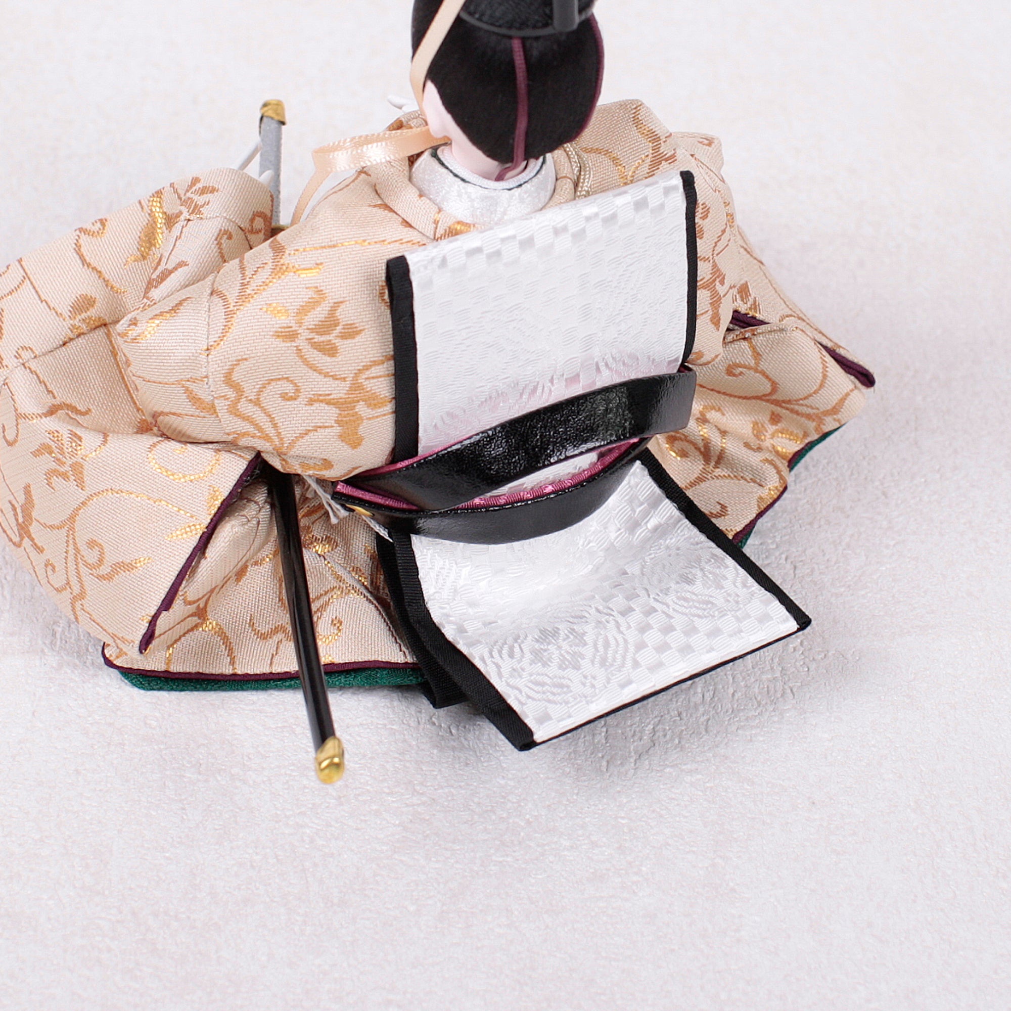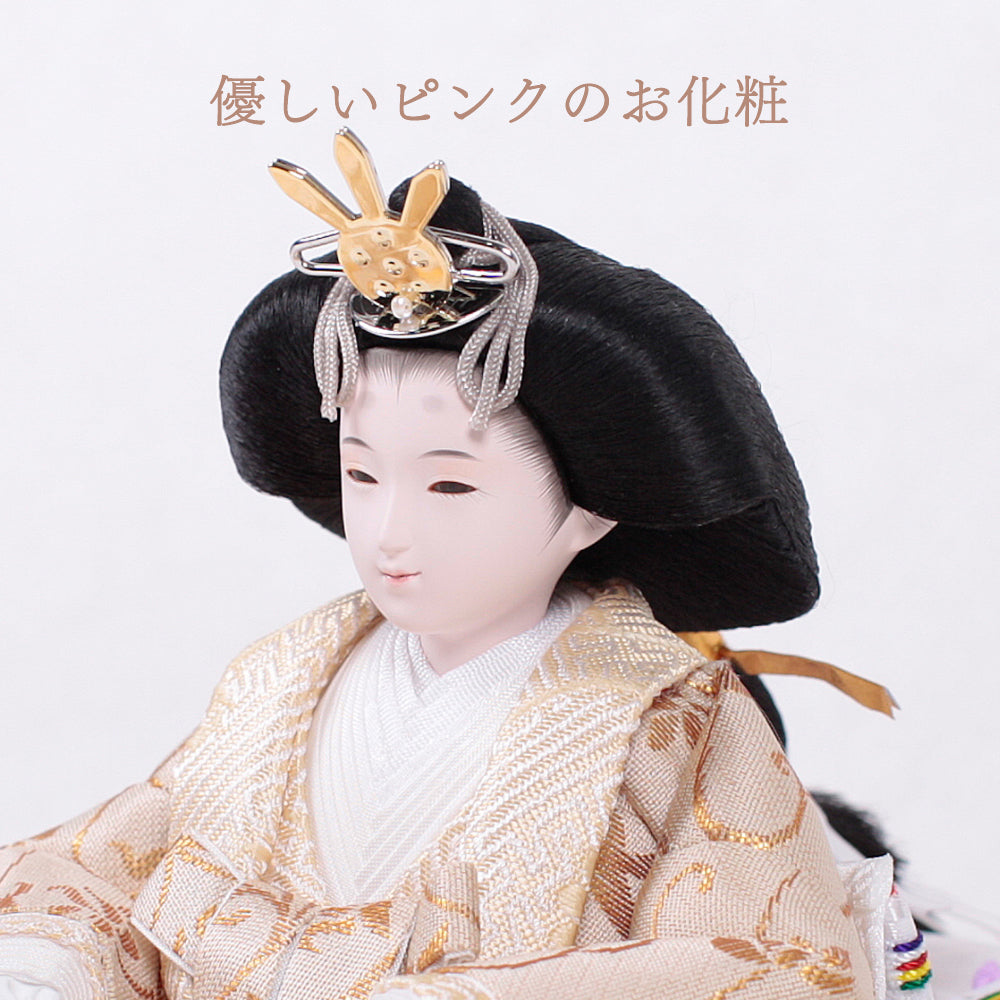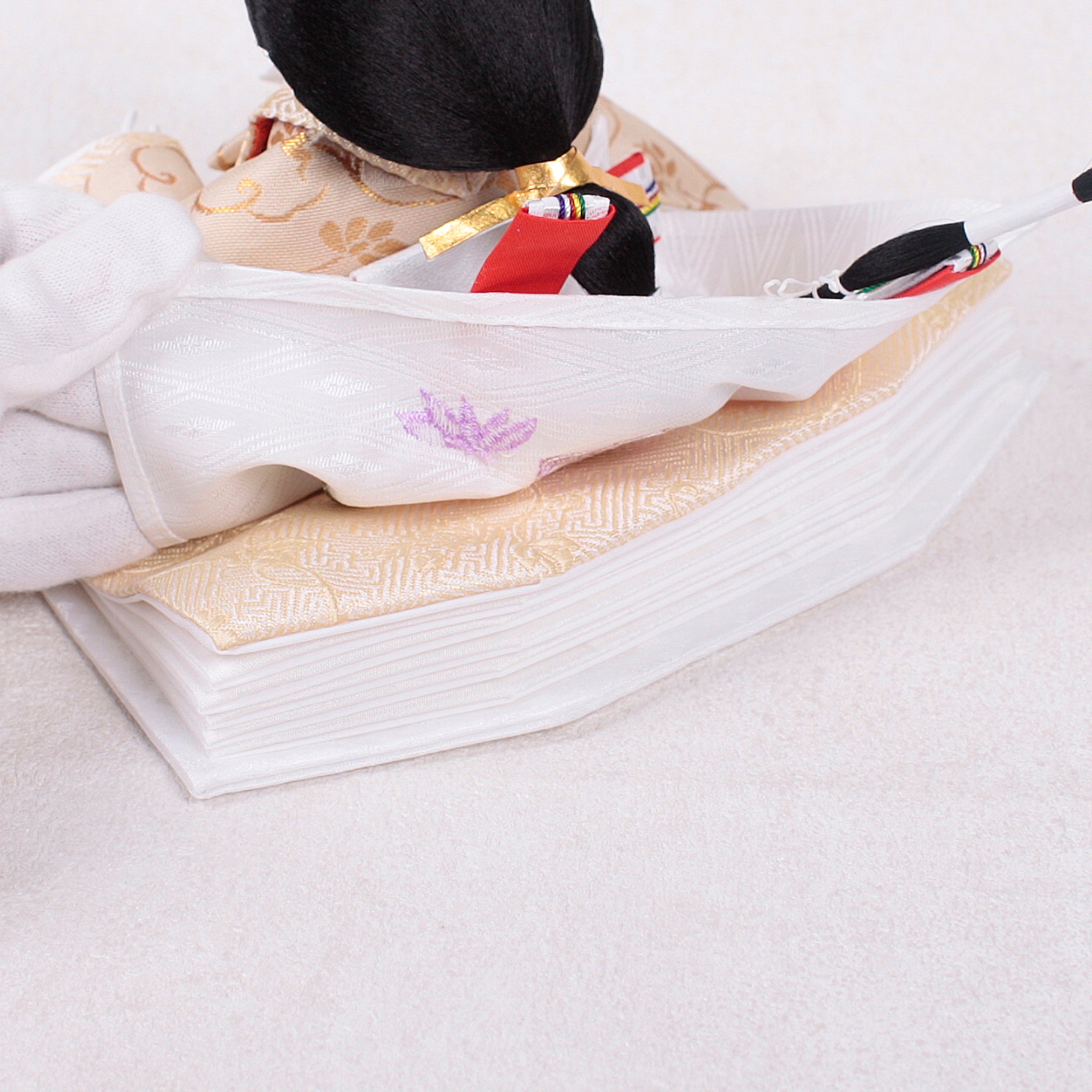 唐草文様と砥の粉色の衣装の雛人形は、赤ちゃんの成長と幸福を願う、生命力と清らかさを象徴する優雅な存在です。
