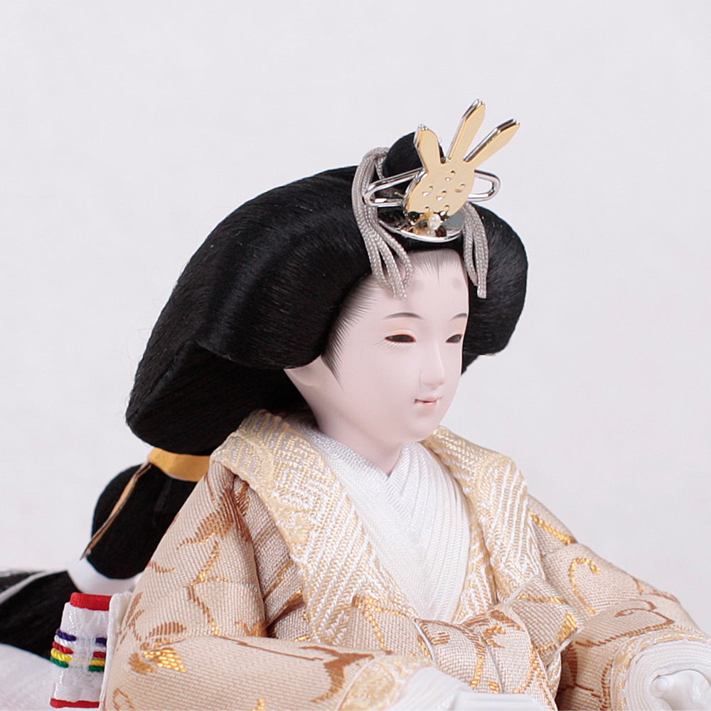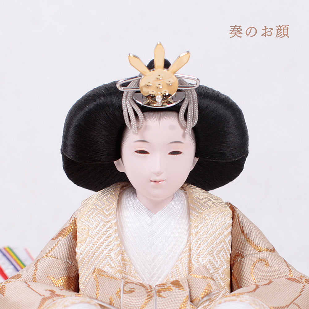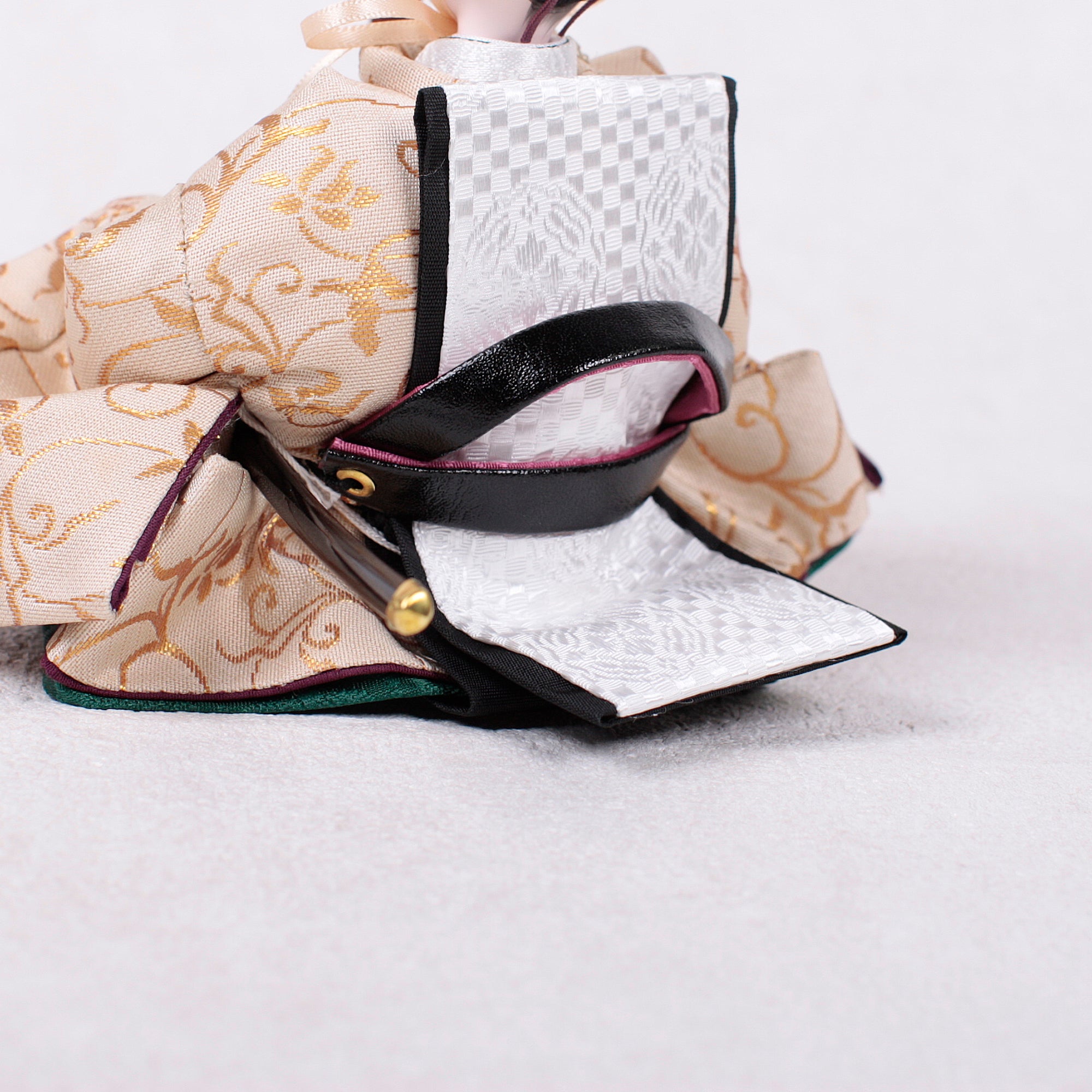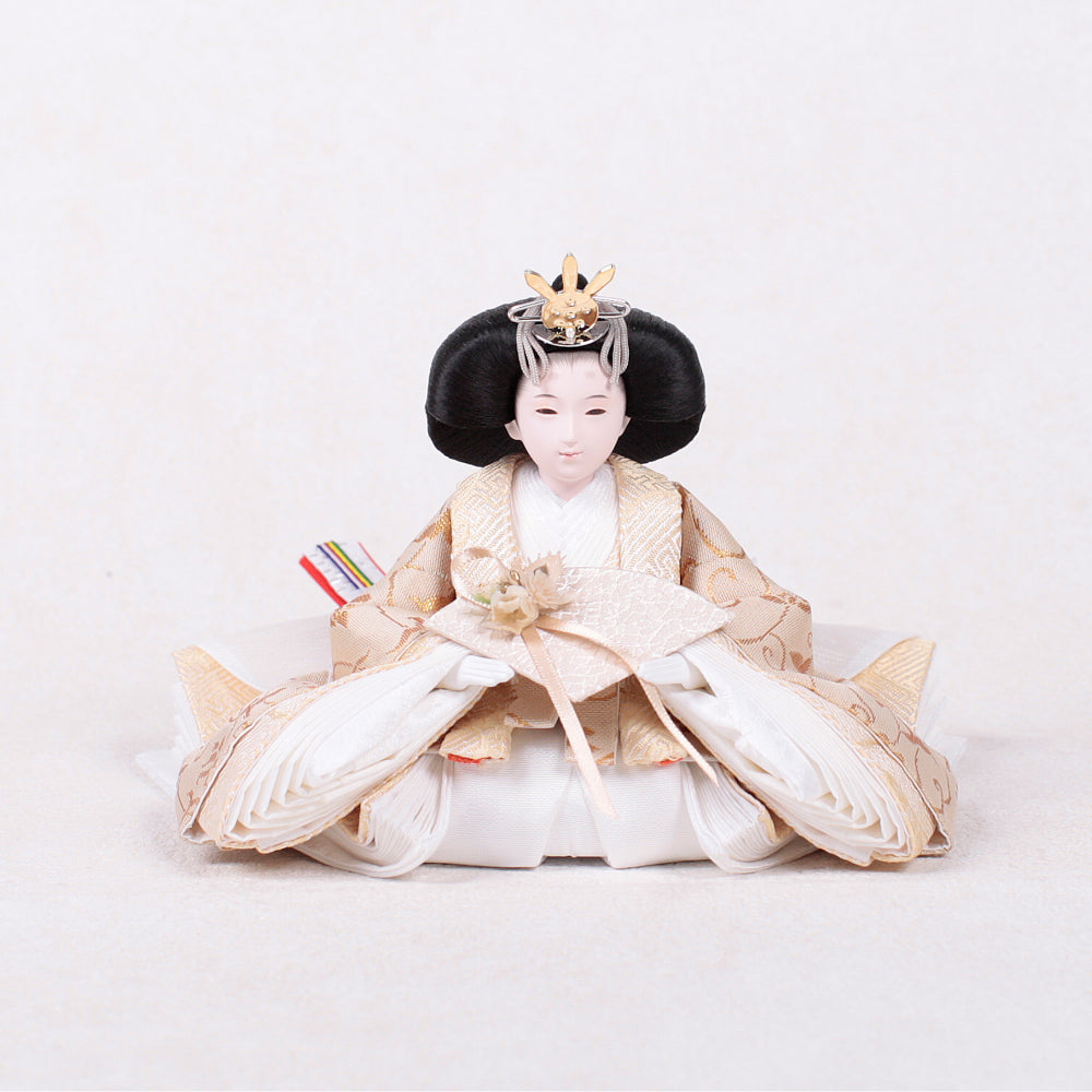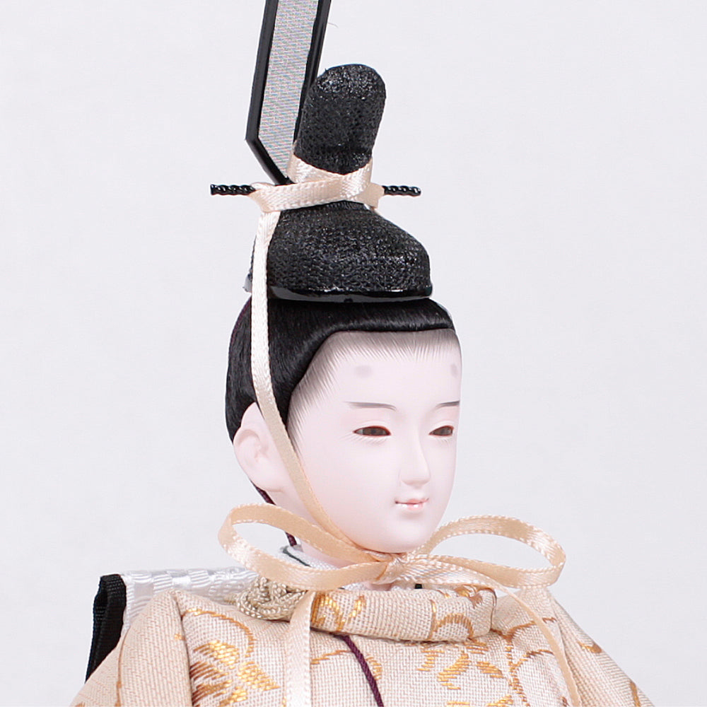 唐草文様と砥の粉色の衣装の雛人形は、赤ちゃんの成長と幸福を願う、生命力と清らかさを象徴する優雅な存在です。