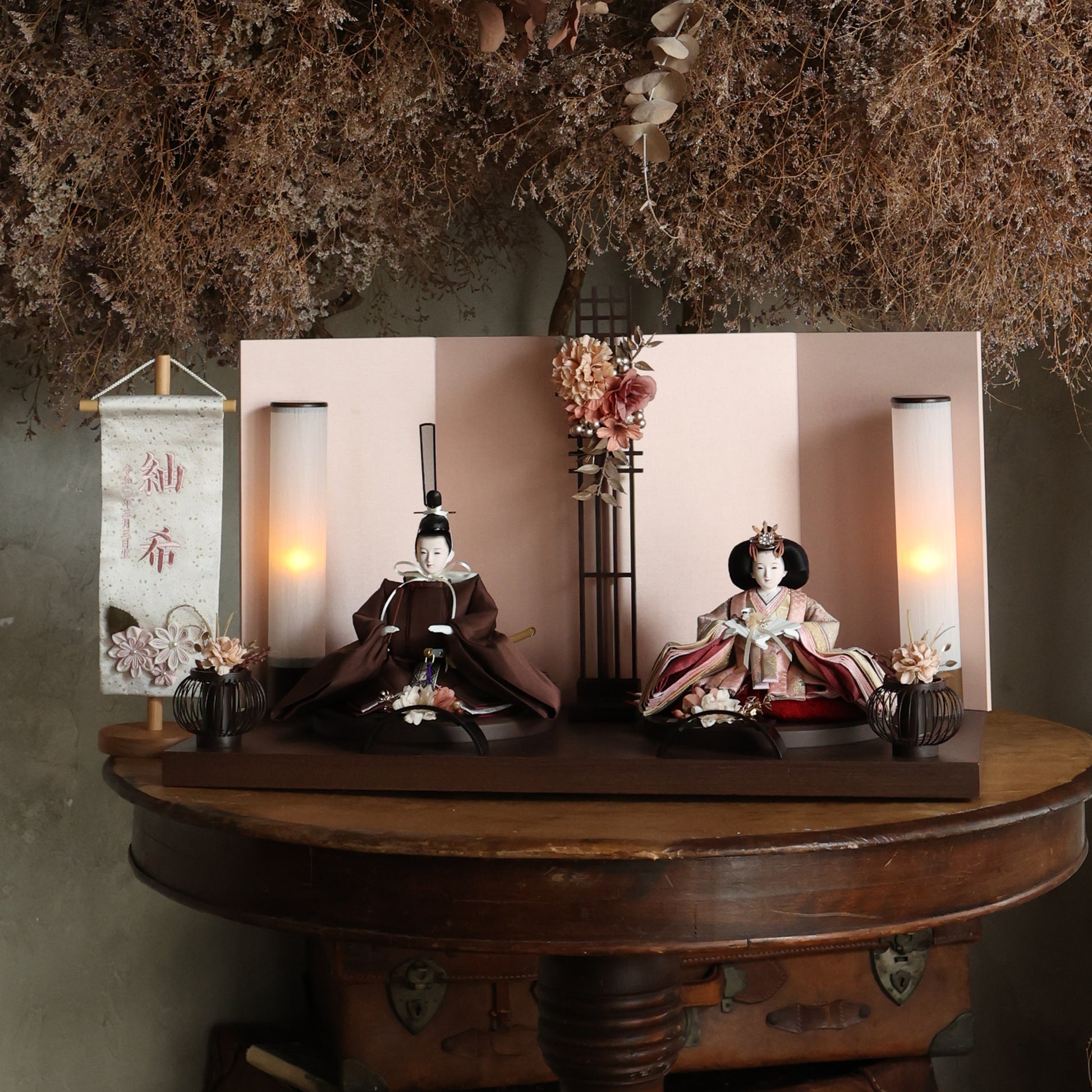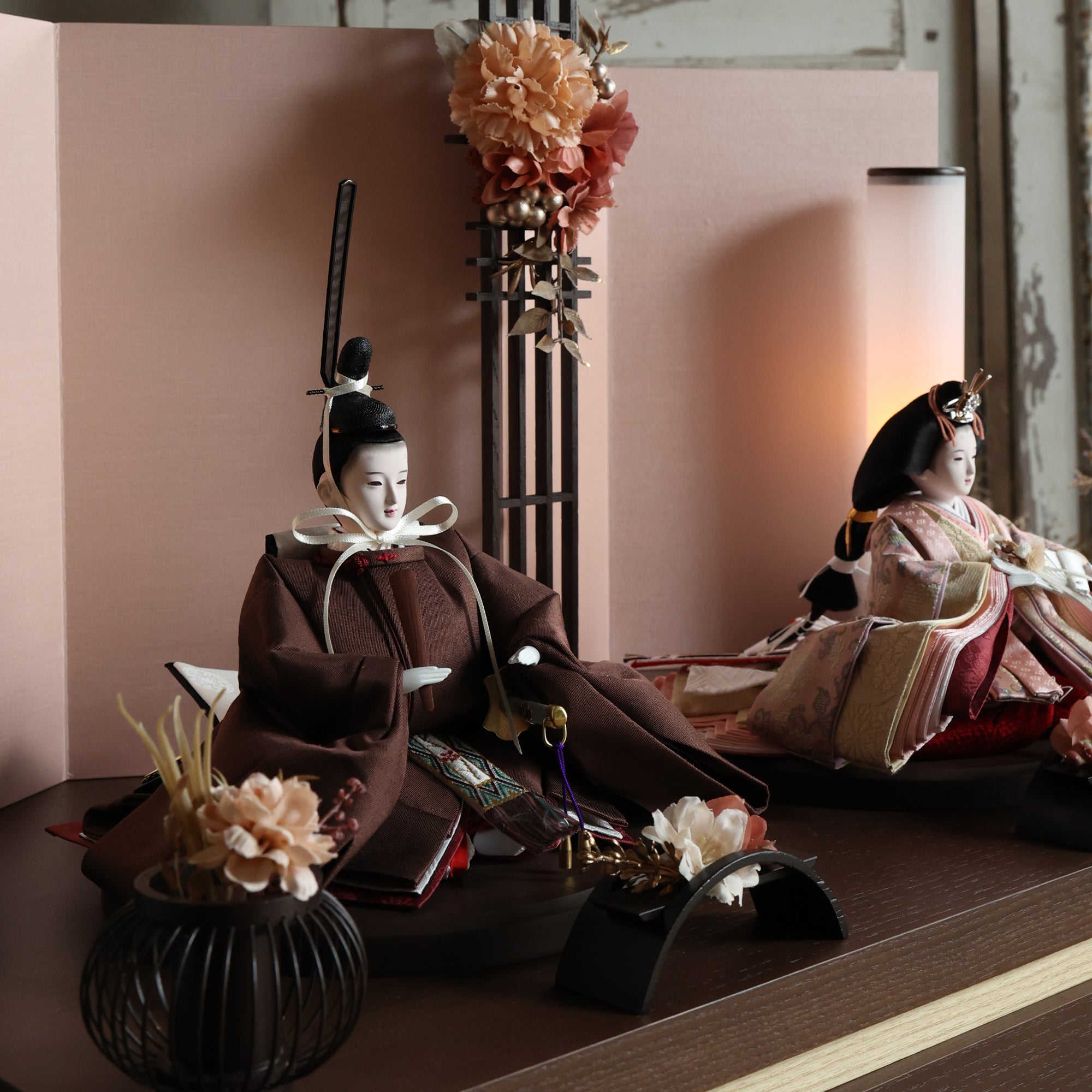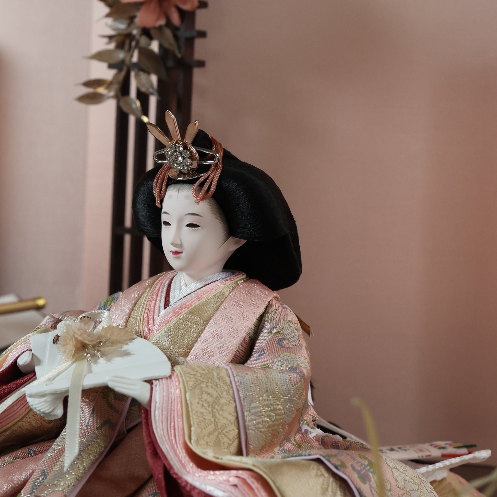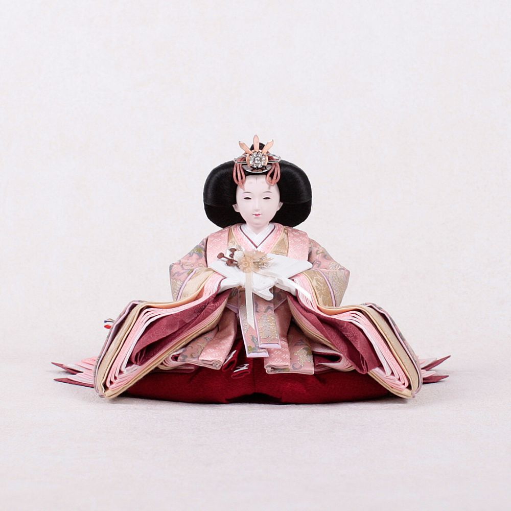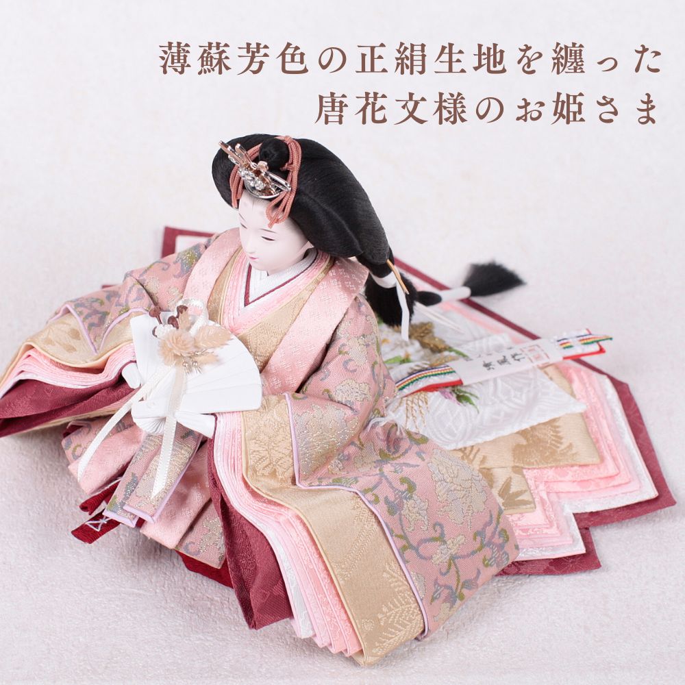 薄蘇芳色の唐花文様が施されたお雛様は、赤ちゃんの成長と繁栄を願う美しい象徴で、春の訪れを祝う大切な宝物です。