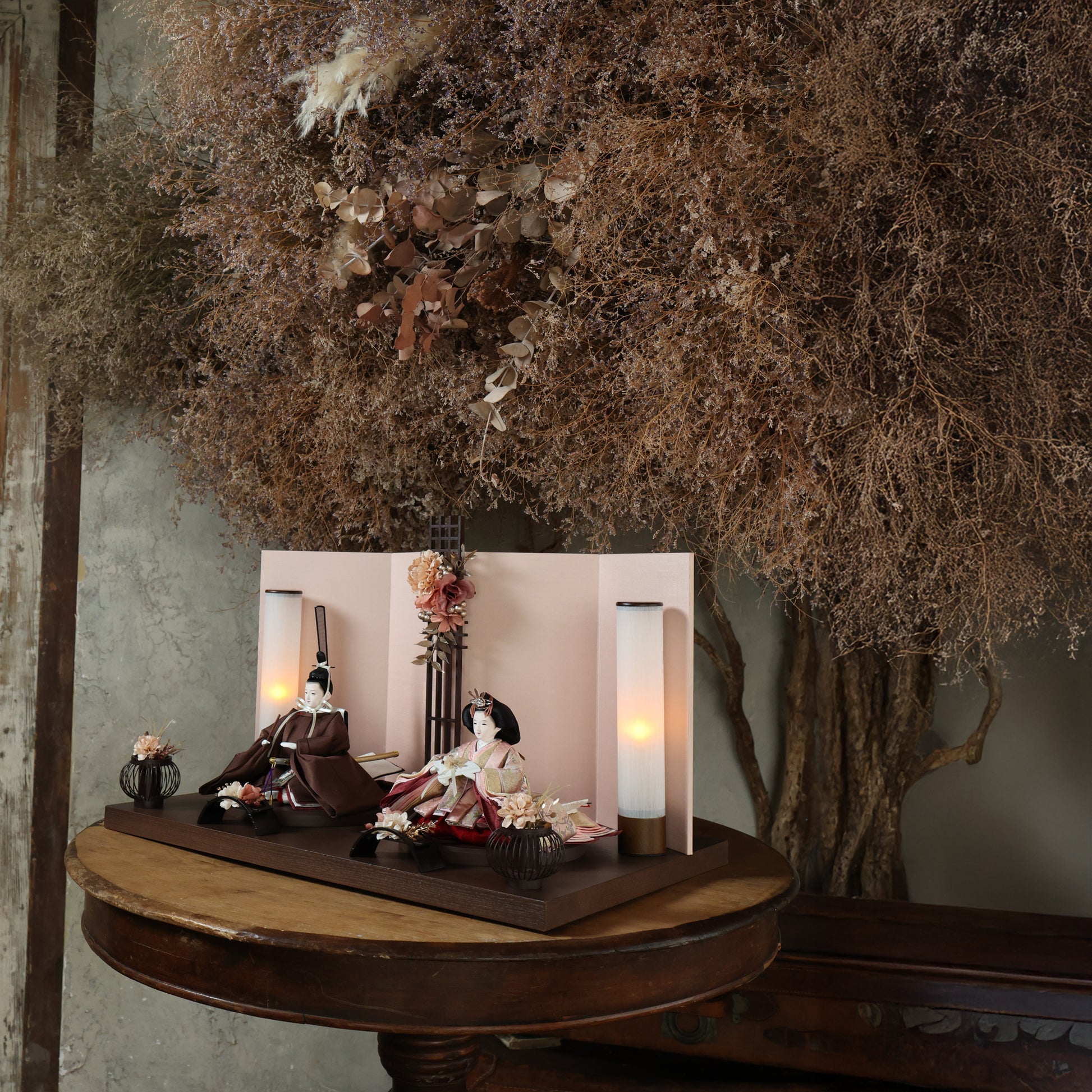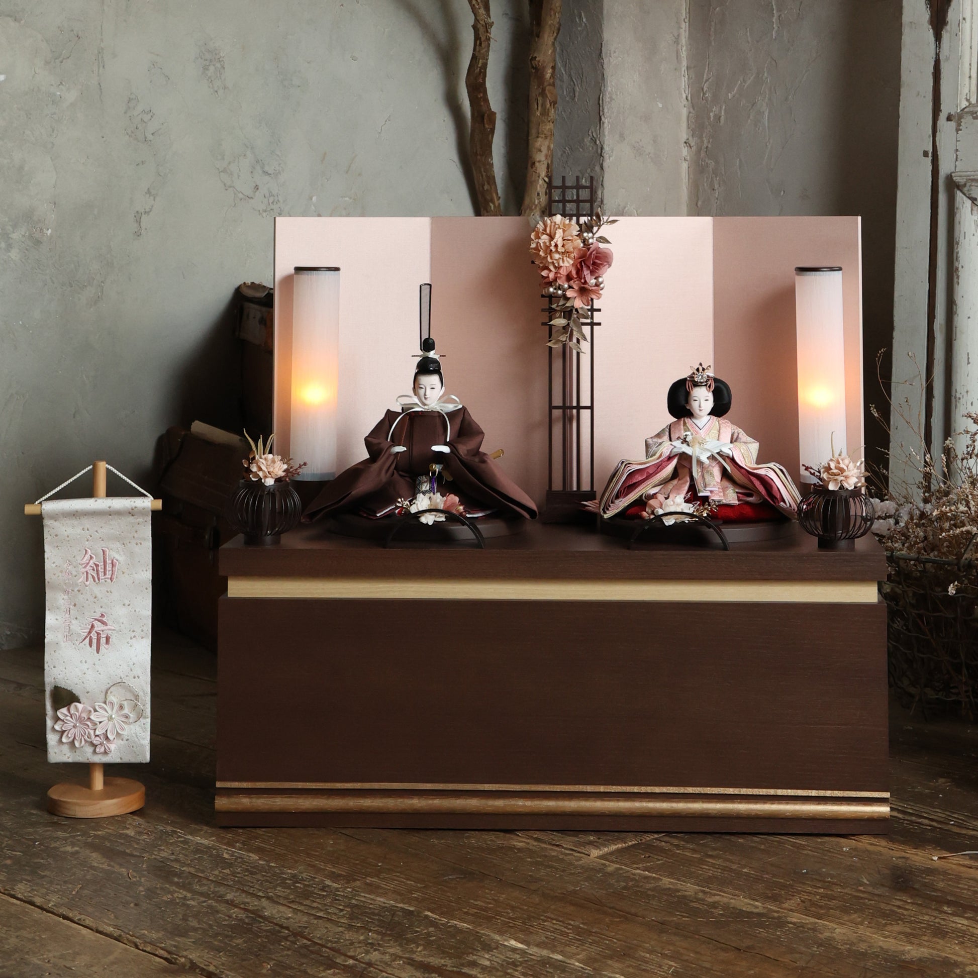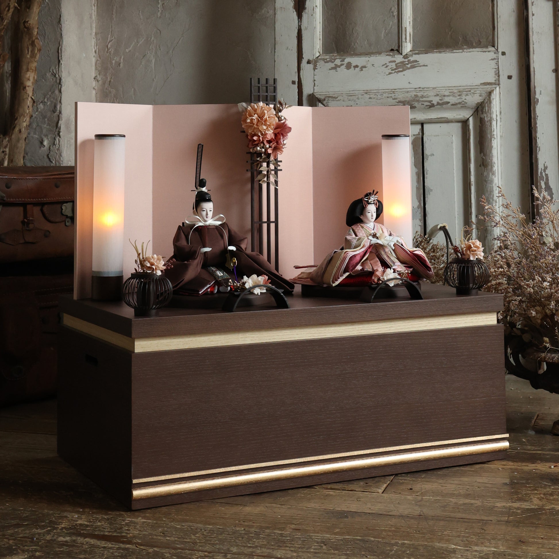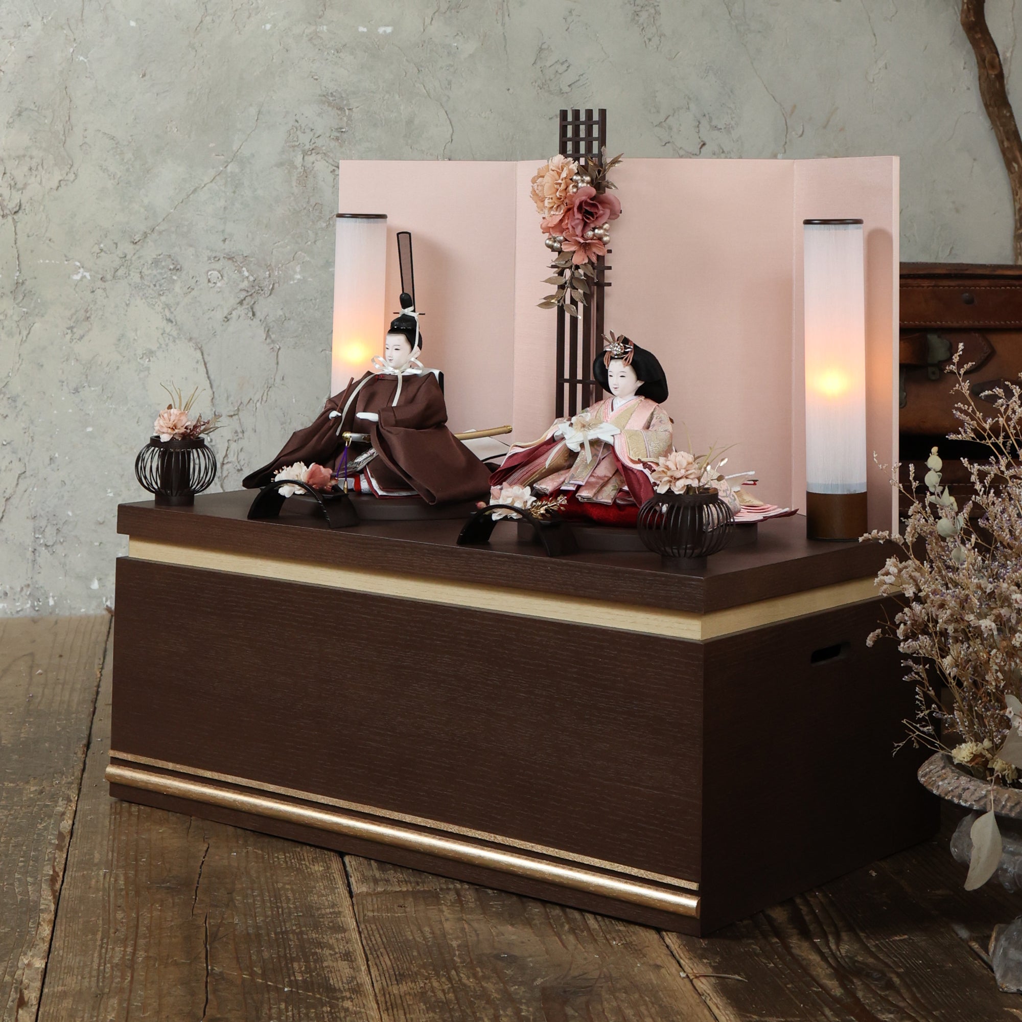 薄蘇芳色の唐花文様が施されたお雛様は、赤ちゃんの成長と繁栄を願う美しい象徴で、春の訪れを祝う大切な宝物です。