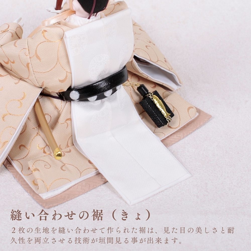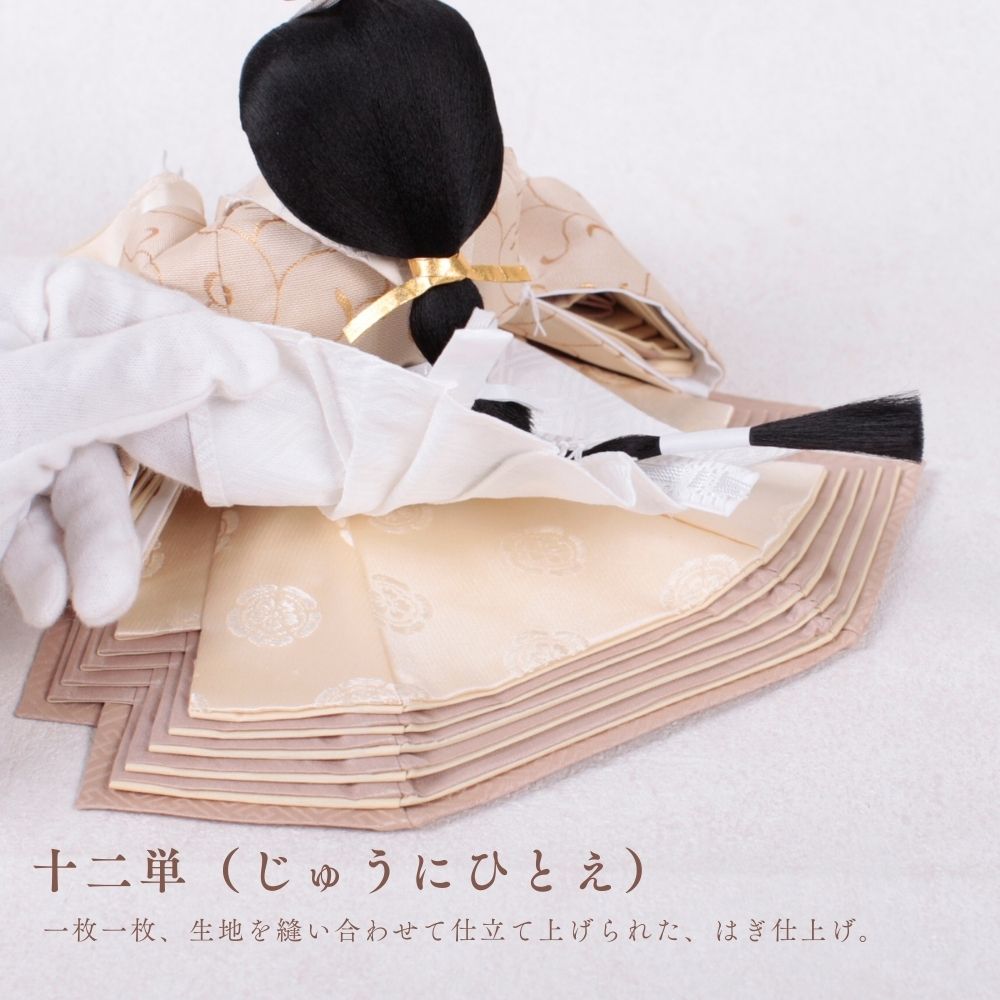 姫の重ねは、見えない所までこだわり一枚一枚剥合わせて縫製しております。裳袴も色合わせに拘り一枚一枚縫い合わせています。