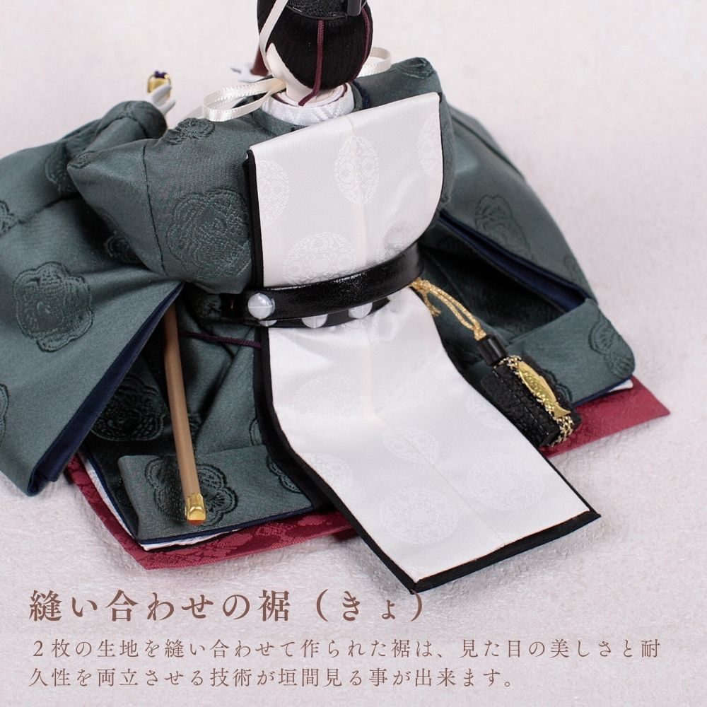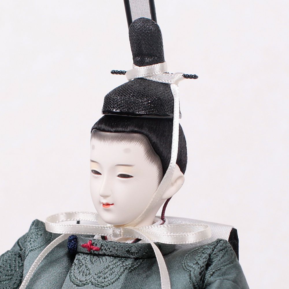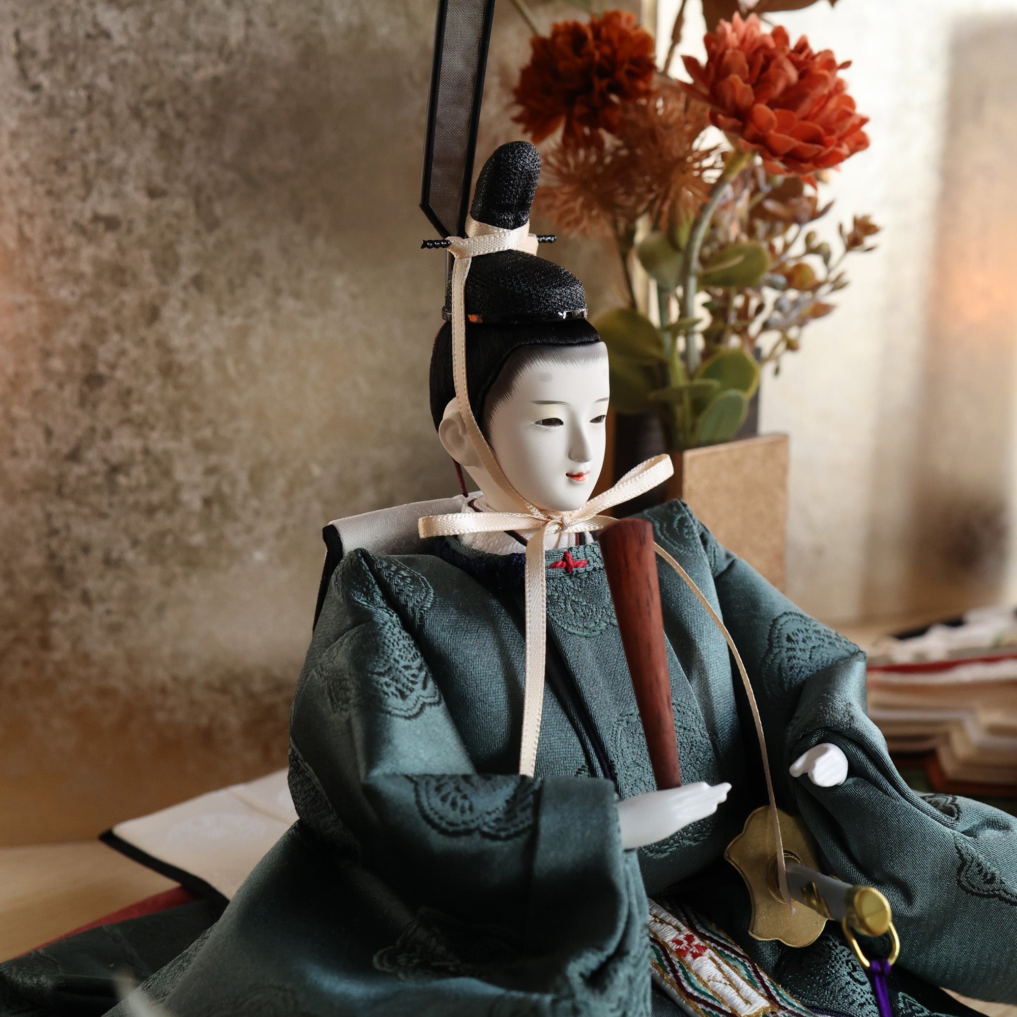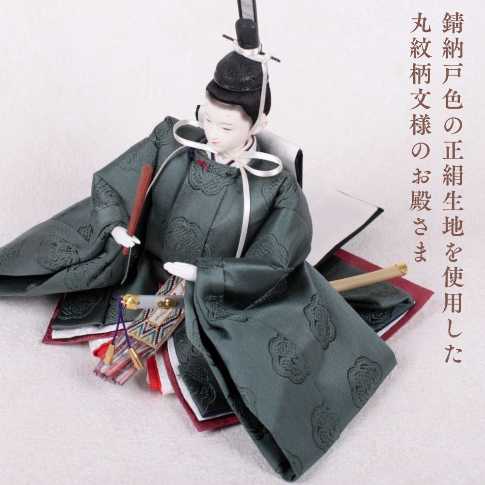 錆納戸色の丸紋雛人形は、赤ちゃんの成長と幸福を願い、温もりと家族の絆を象徴する優雅な存在です。
