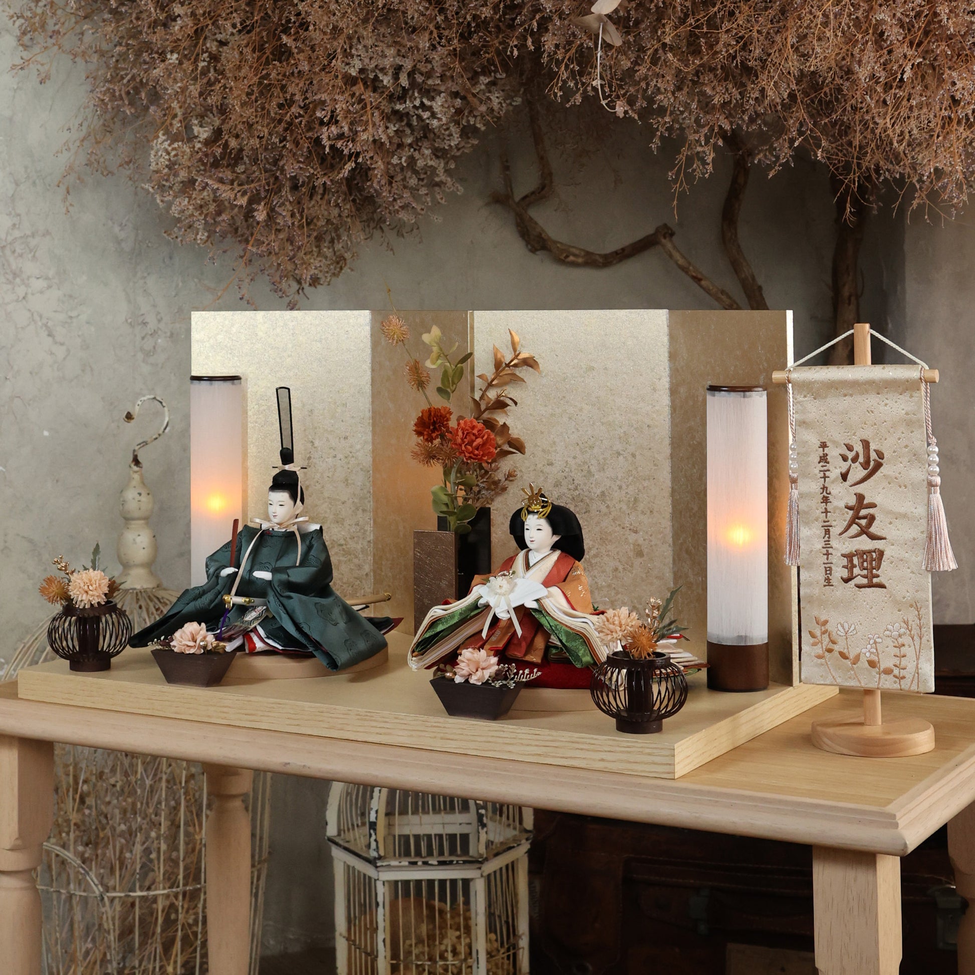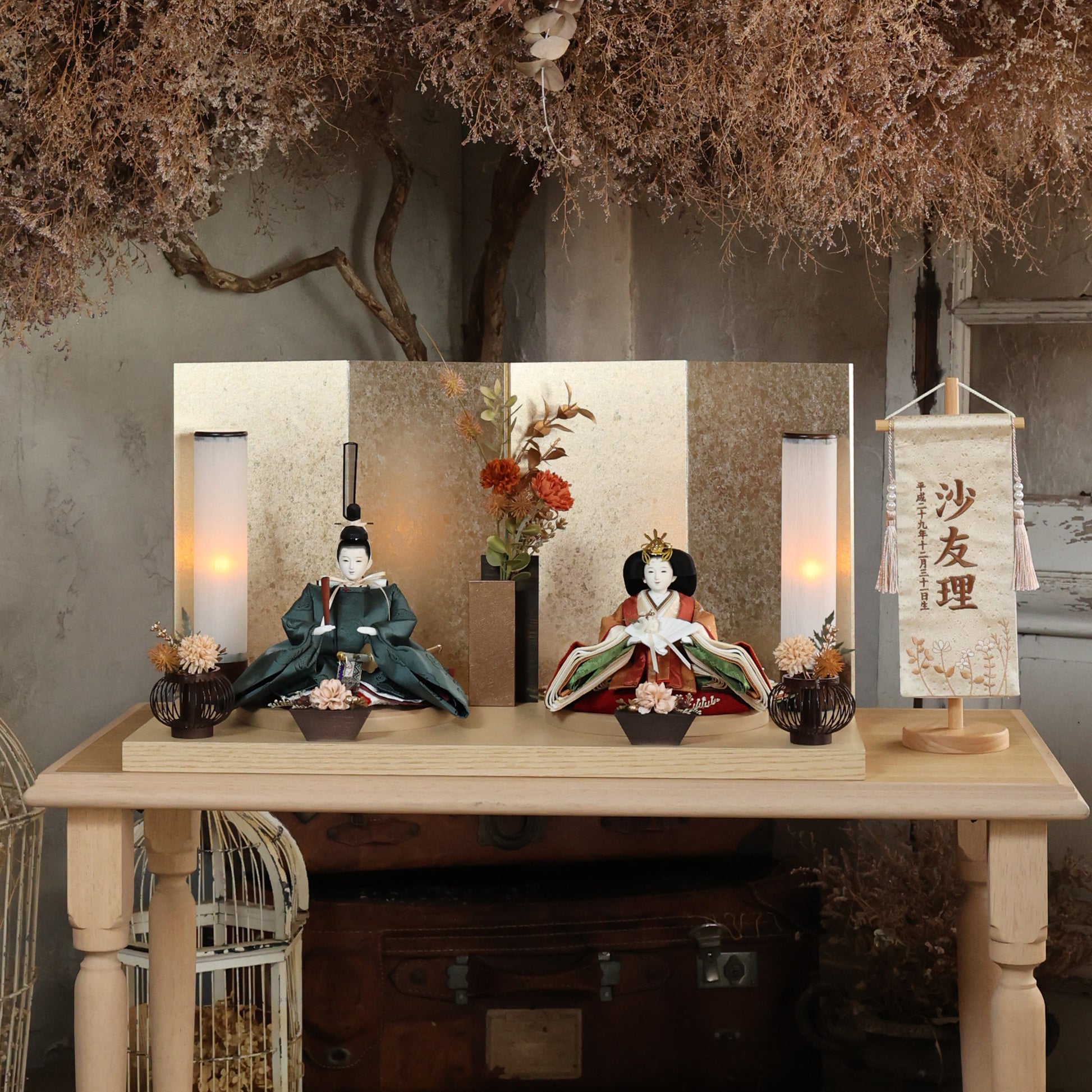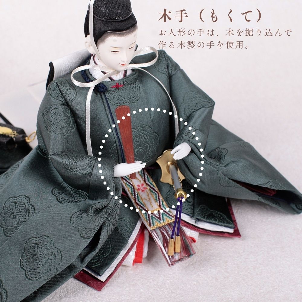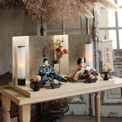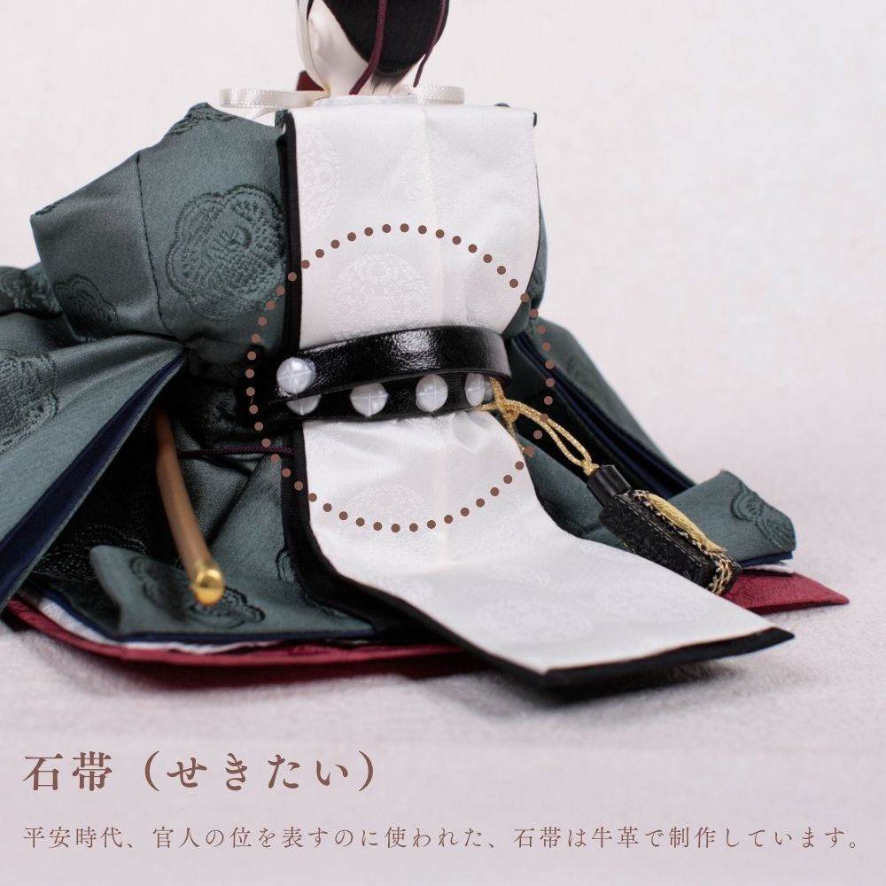 錆納戸色の丸紋雛人形は、赤ちゃんの成長と幸福を願い、温もりと家族の絆を象徴する優雅な存在です。