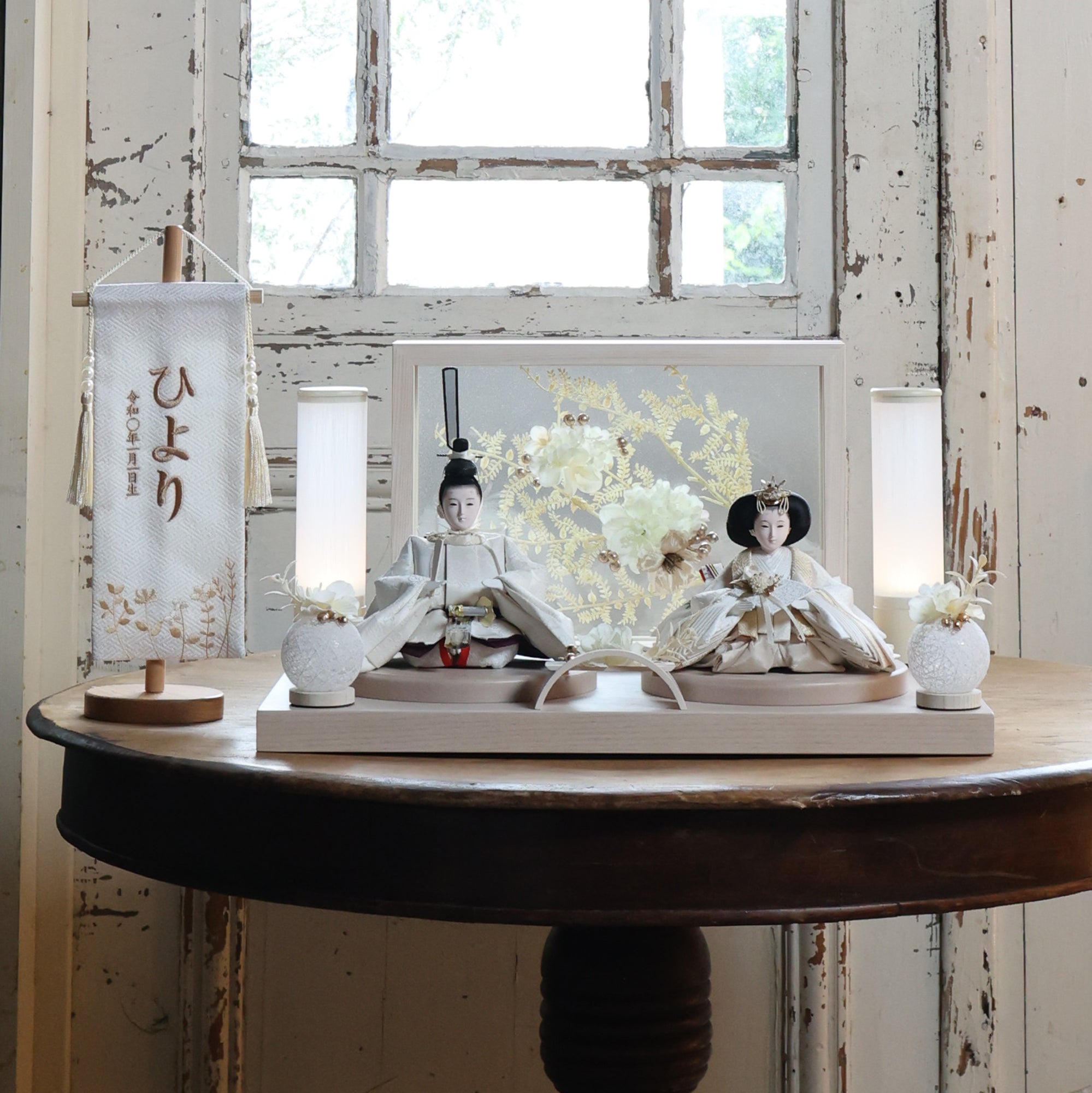 フレームには、純白からやわらかく色づくハイドランジア、優しい光をまとうクリームホワイトのダリア、そして穏やかなぬくもりを添えるブロッサムをあしらいました。白のグラデーションが象徴するのは、無垢な心と新しい門出。ひとつひとつの花が重なり合うように、たくさんの愛に包まれて、やさしくまっすぐに育っていってほしいという願いを込めています。