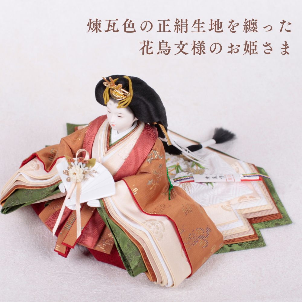 煉瓦色の正絹生地を纏った花鳥文様のお姫さま