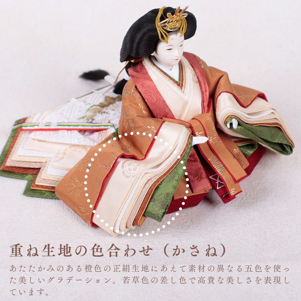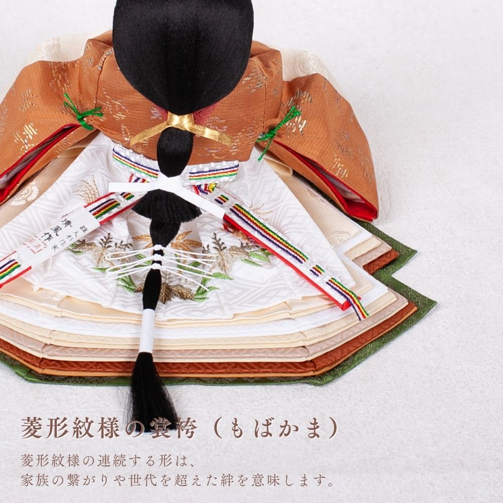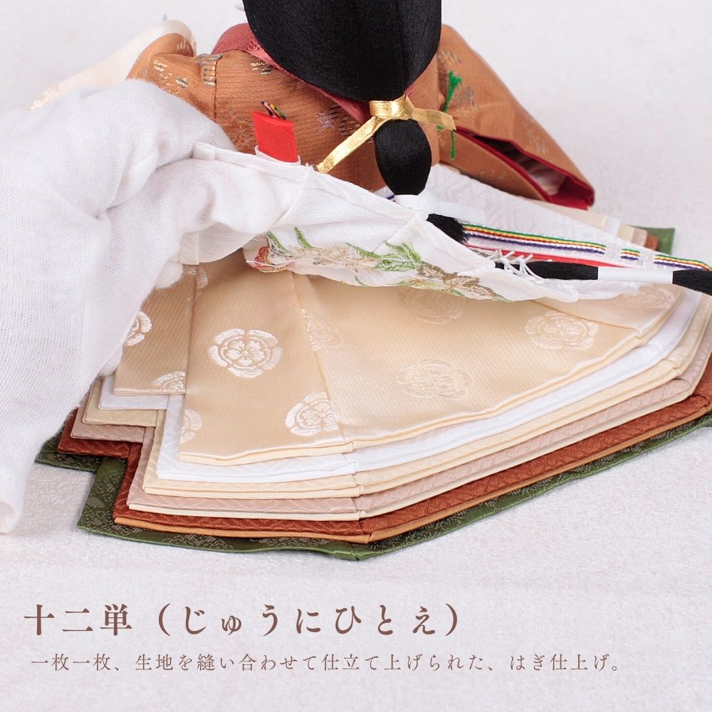 姫の重ねは、見えない所までこだわり一枚一枚剥合わせて縫製しております。裳袴も色合わせに拘り一枚一枚縫い合わせています。