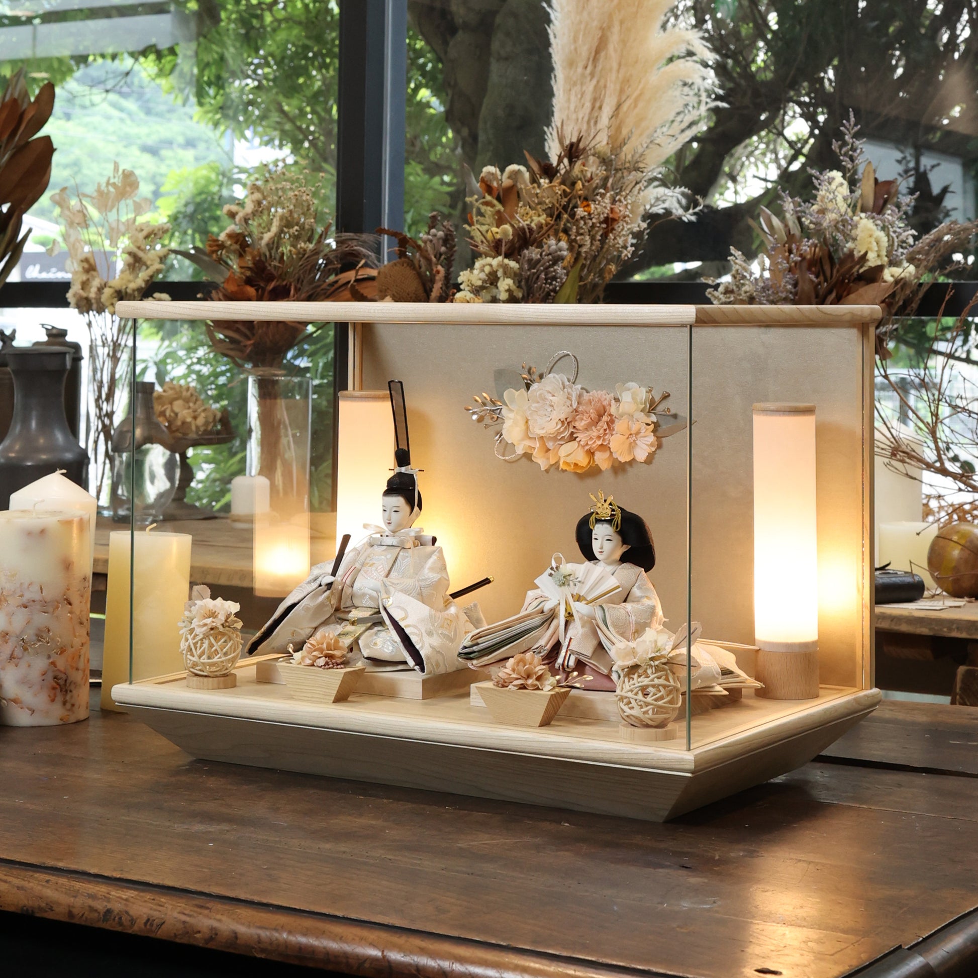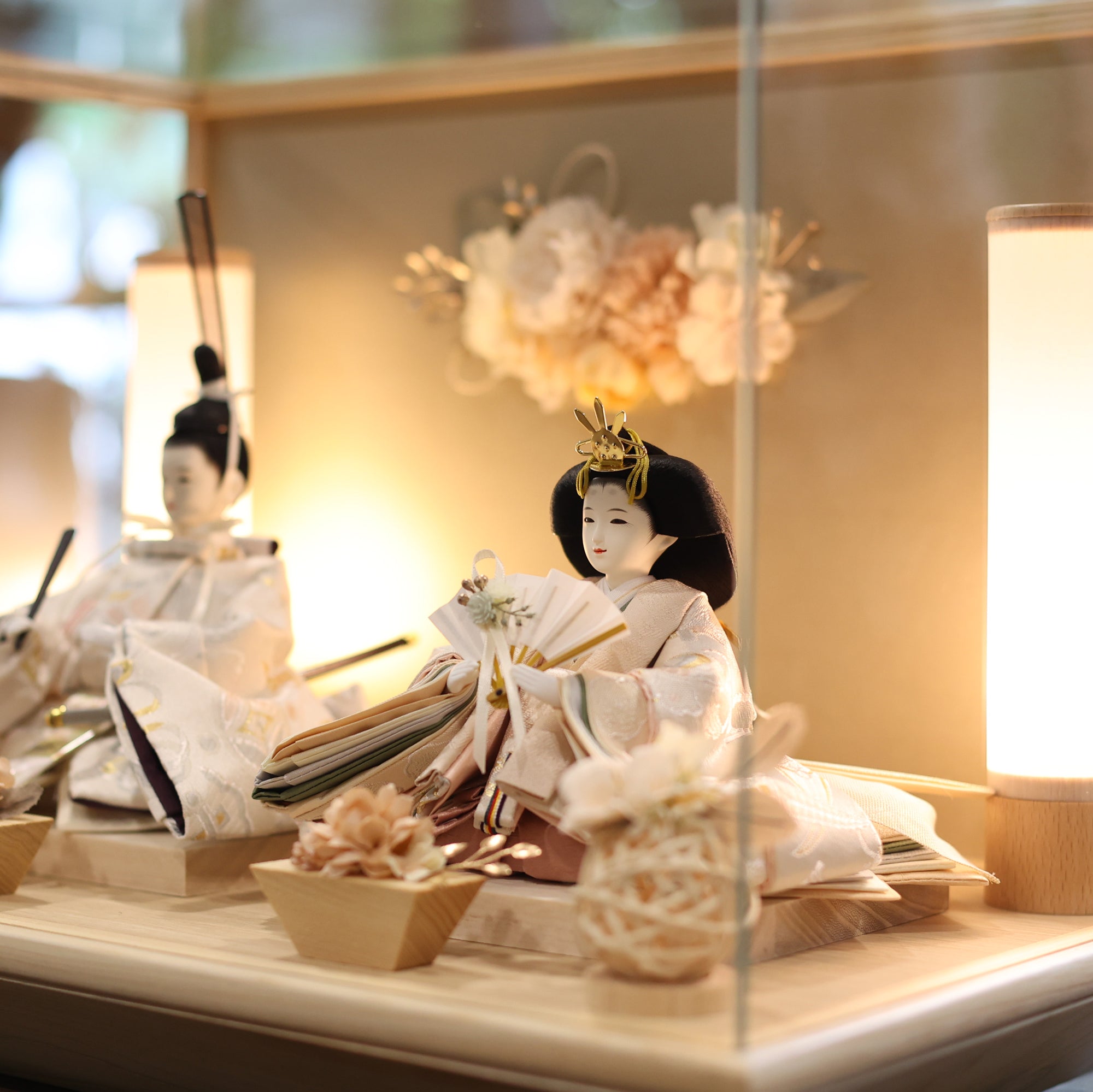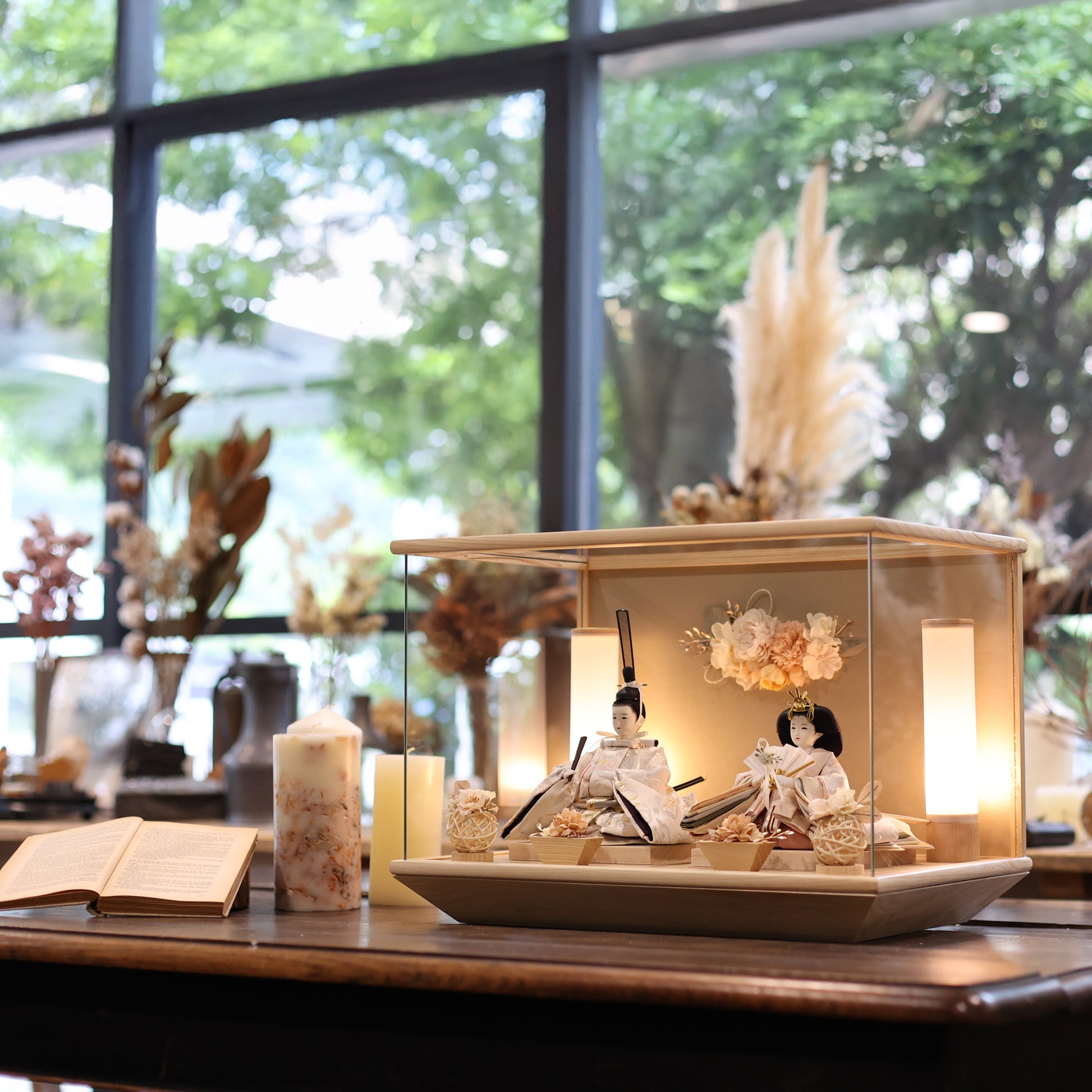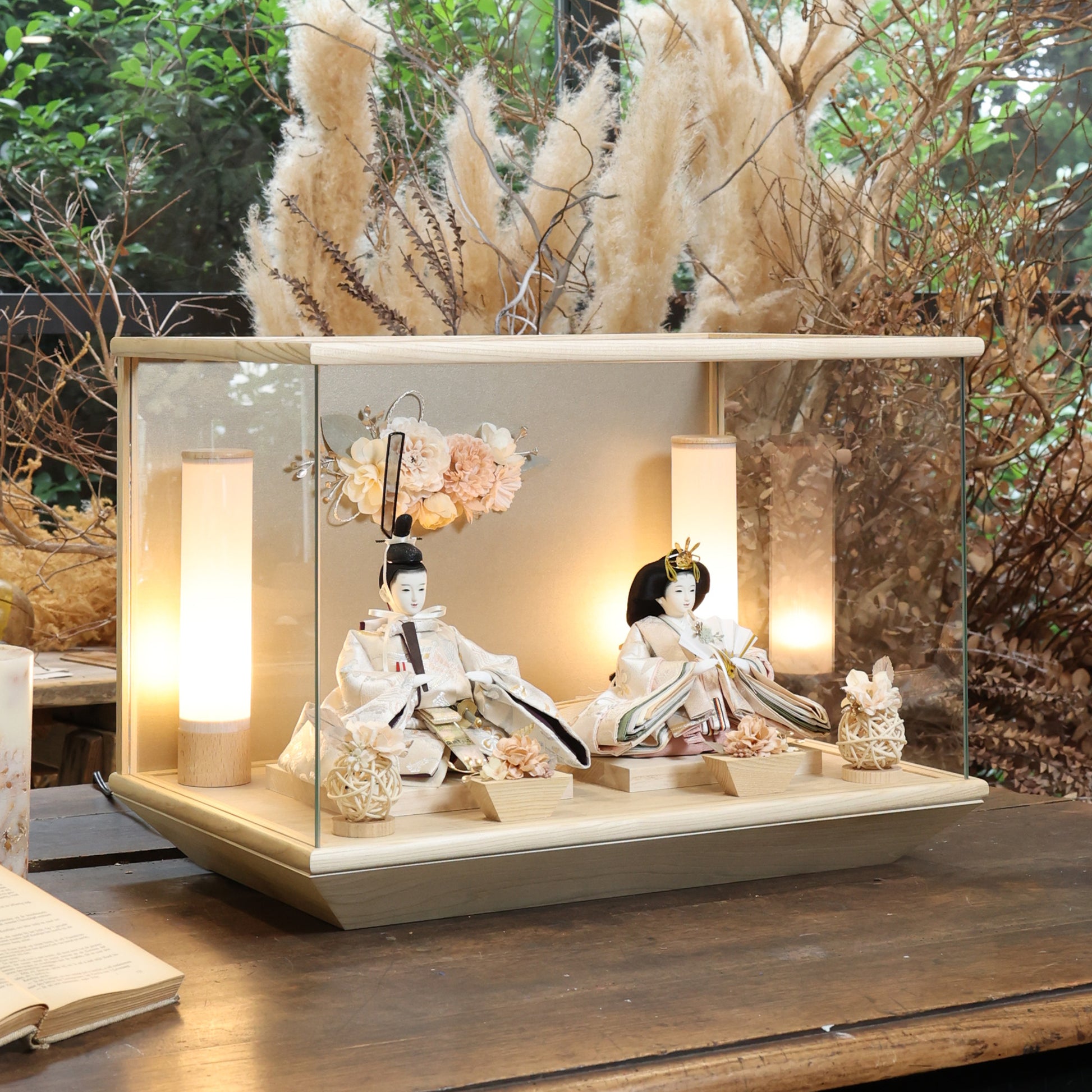 通常2mm厚が一般的な中、当店ではより高品質なAGC製3mmガラスを採用しています。厚みが増すことで強度と安全性が高まり、透明度の高いクリアな美しさを保ちます。大切な雛人形を守りながら、高級感のある見栄えを実現しています。
