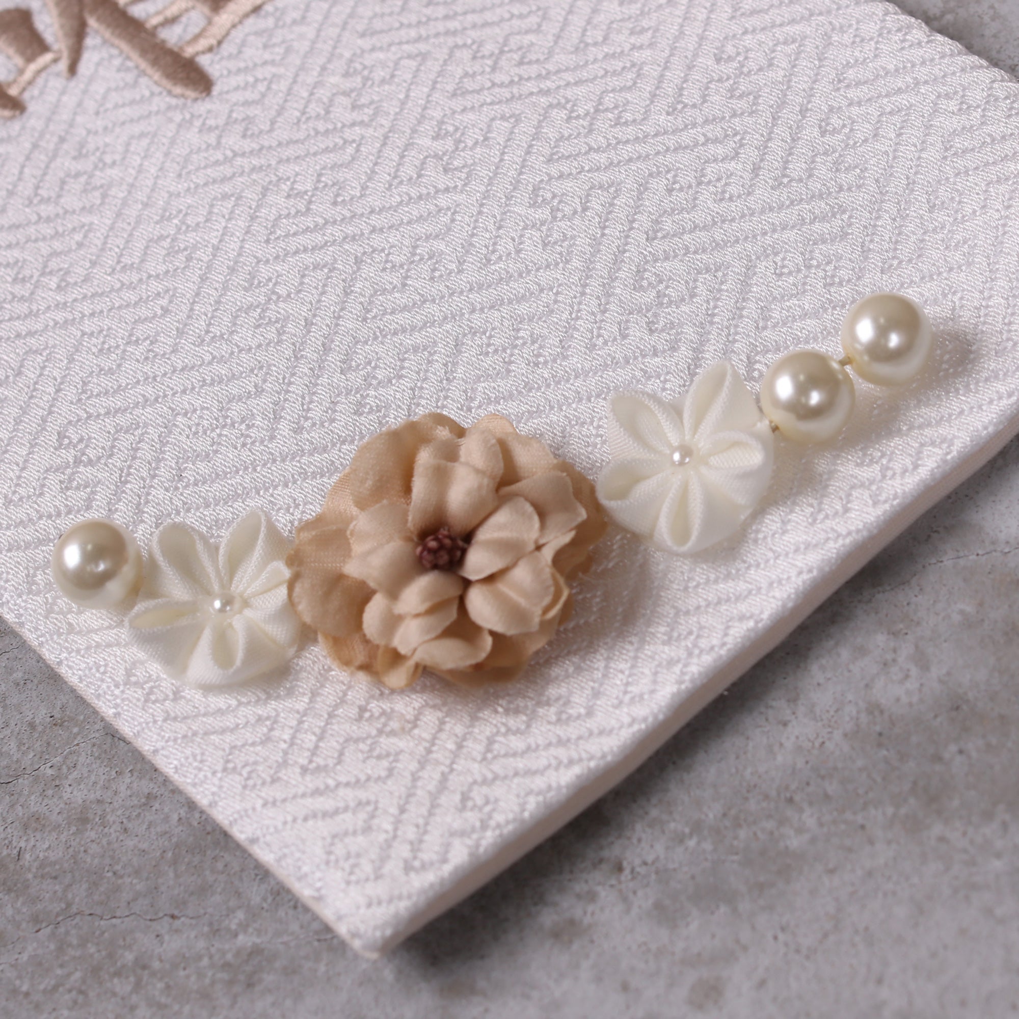 「tumamiパール | 牡丹・マムのつまみ細工に、生地の紗綾形文様とパールが華やかさを添える名前旗」
