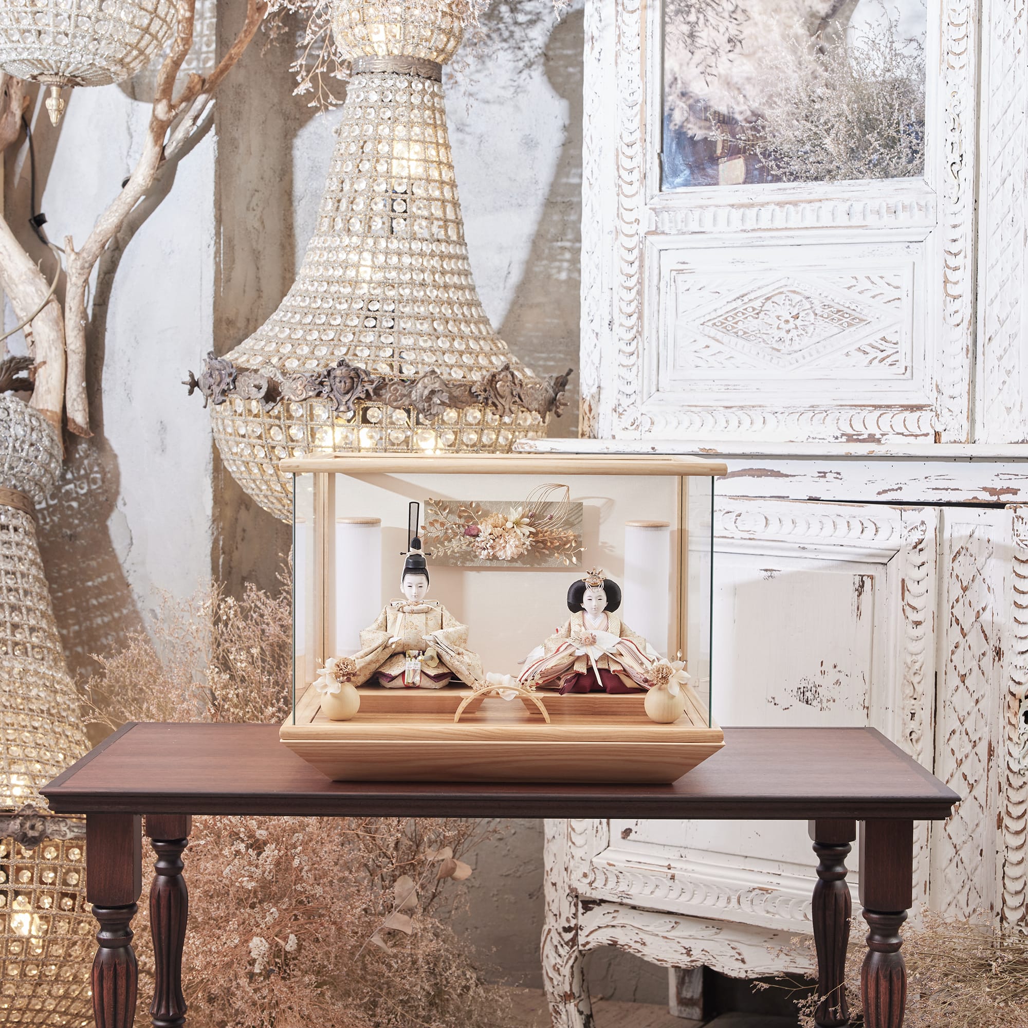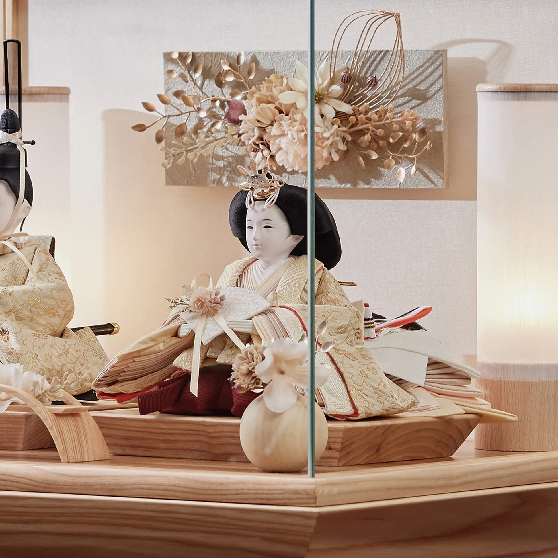 通常2mm厚が一般的な中、当店ではより高品質なAGC製3mmガラスを採用しています。厚みが増すことで強度と安全性が高まり、透明度の高いクリアな美しさを保ちます。大切な雛人形を守りながら、高級感のある見栄えを実現しています。